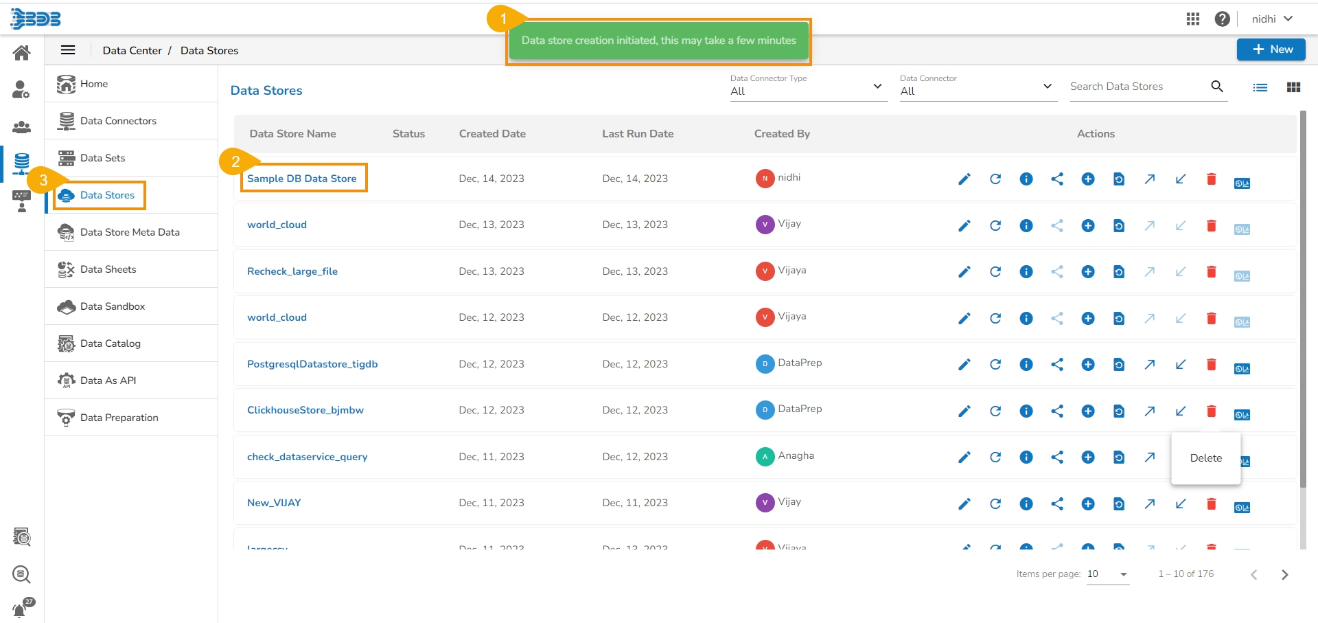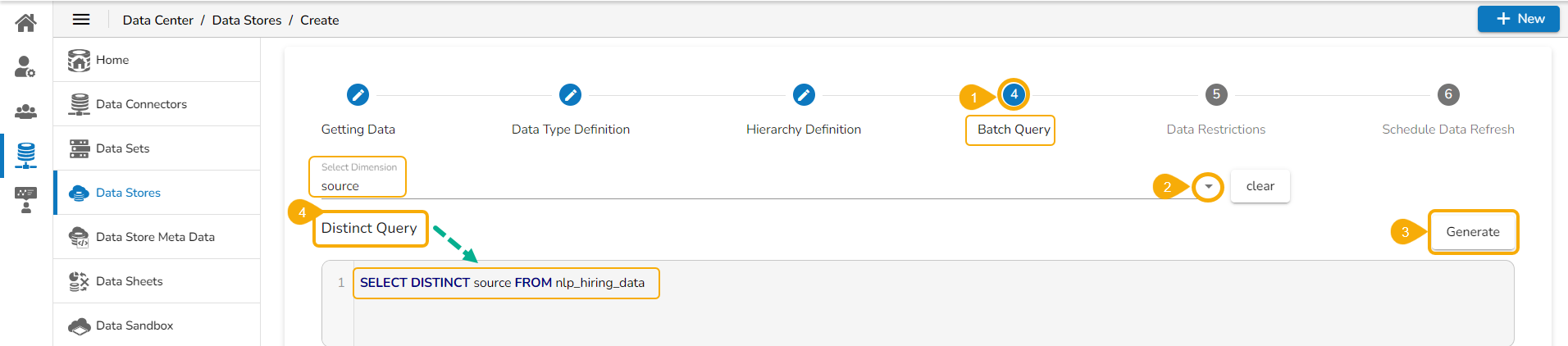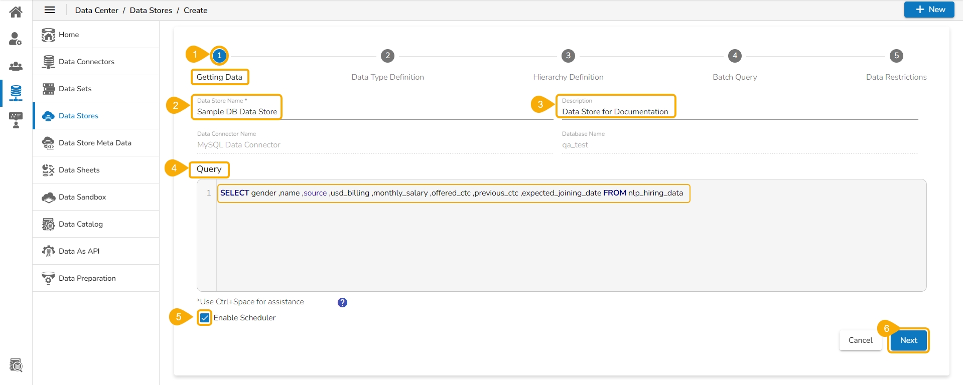 Enter a name for the Data Store. The Data Connector and Database names get displayed based on the selection of the data connector.