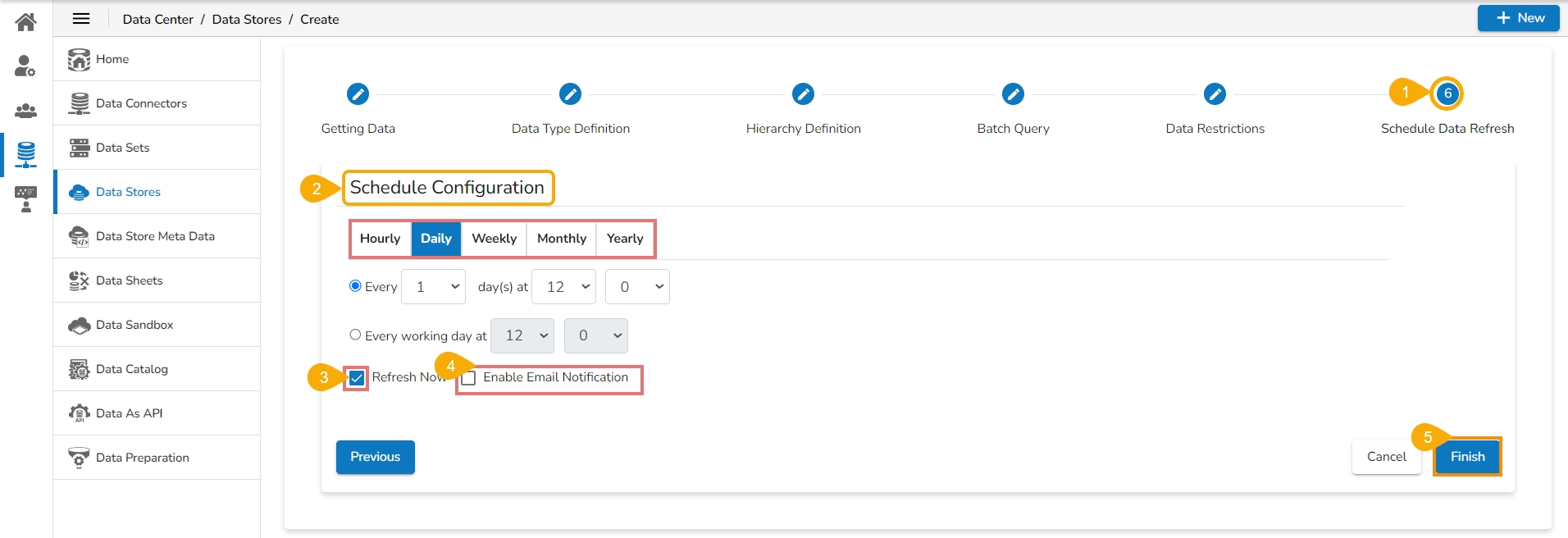 Navigate to the Schedule Data Refresh tab. (This tab only appears for the Data Stores where scheduler has been enabled using the Getting Data tab).