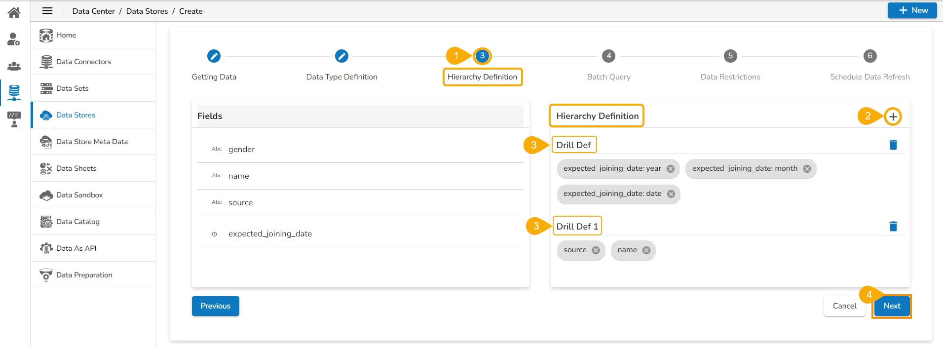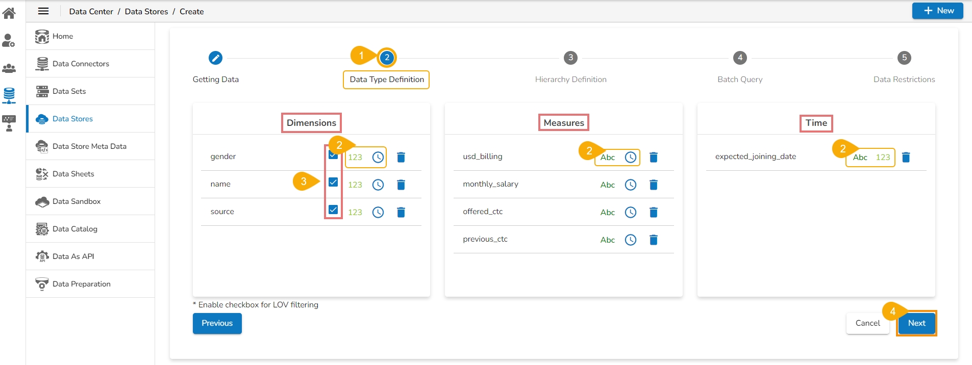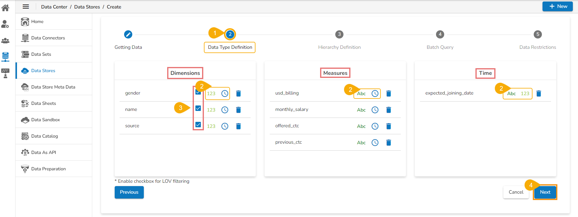 This tab allows users to define the data type using the selected data store. They can interchange the Dimensions, Measures, and Time fields by selecting the respective icons provided for these fields.