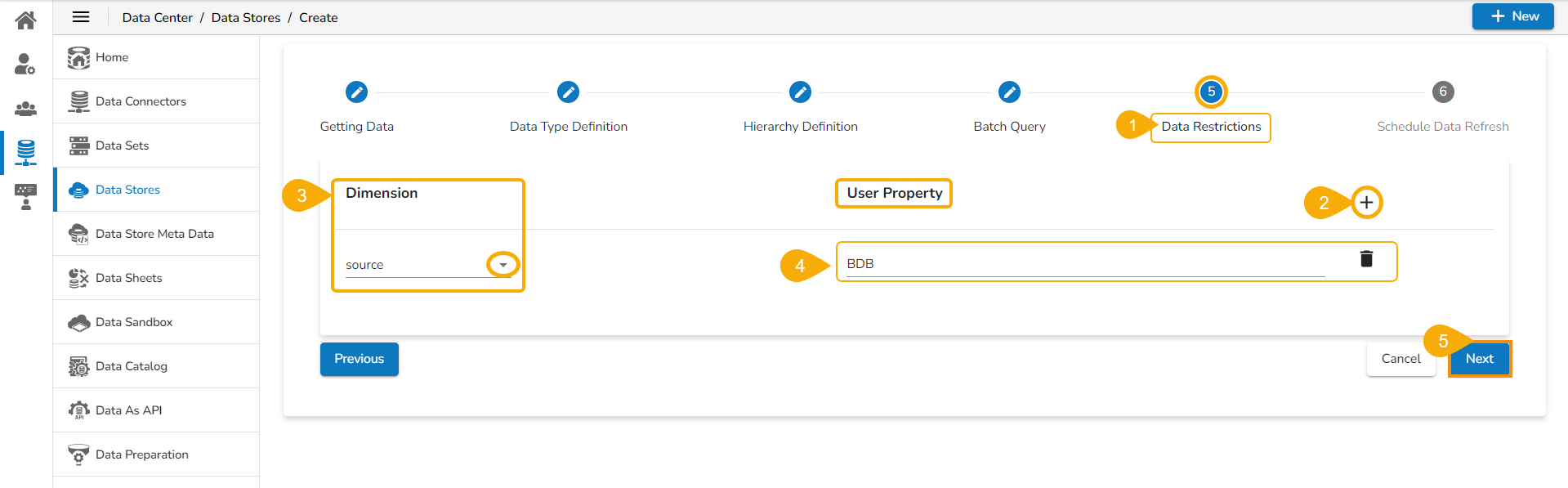 Please Note: The Administrator can restrict access to data for a specific user by configuring the User. Property via the Data Restriction tab. E.g., If for a user/user group Country custom field is provided value India, and the administrator passes Country as User Property while creating a data store. The users for whom India was selected as the value for the Country custom field can access data regarding India only.
