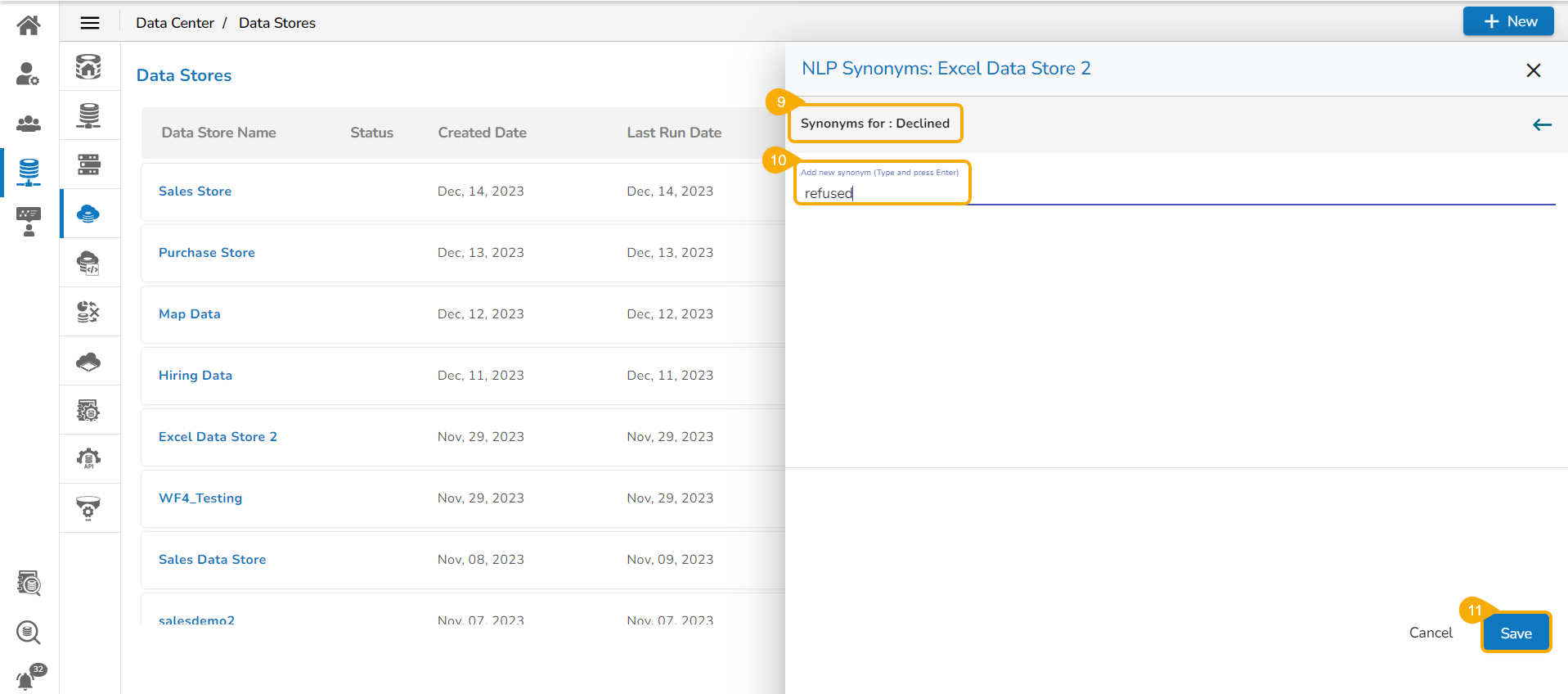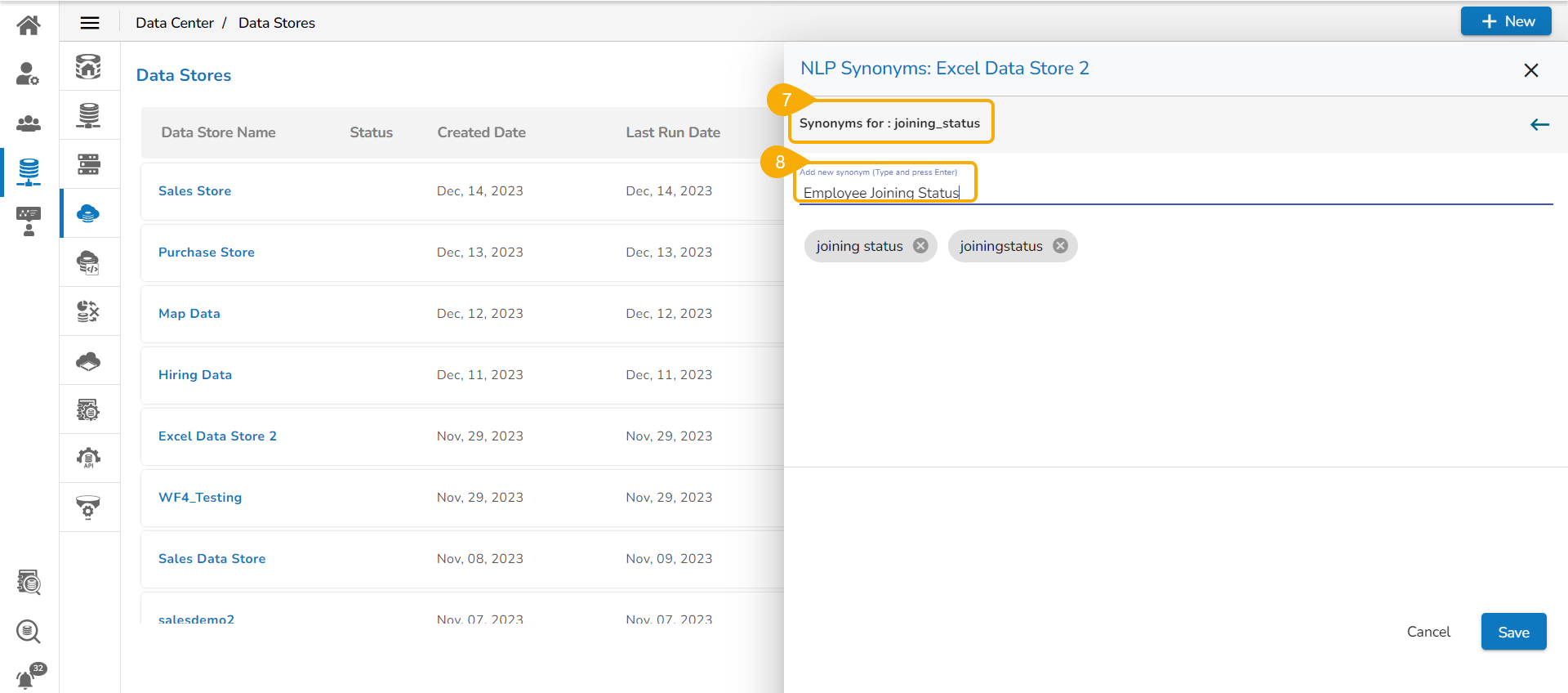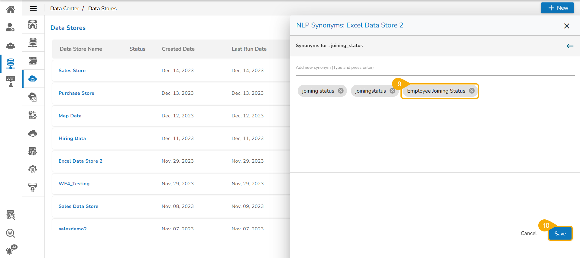 Navigate to the NLP Synonyms window for a data store.