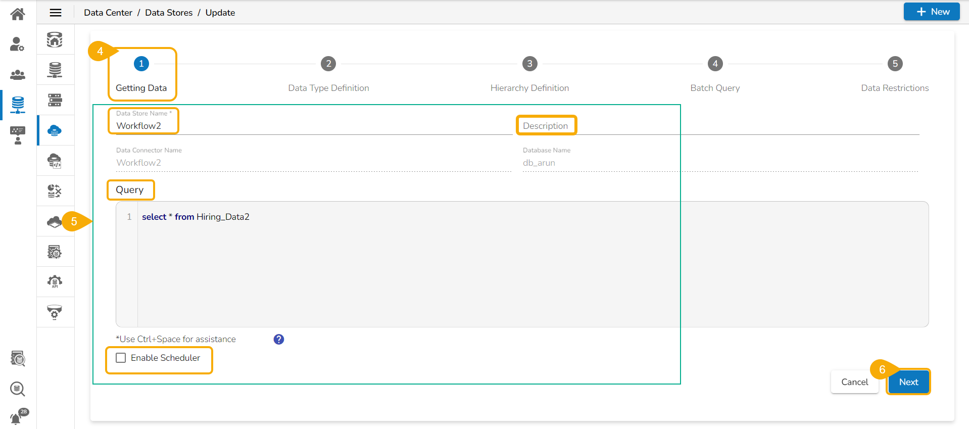 The user can edit the required details under the various steps of the Data Store till the last step gets configured.