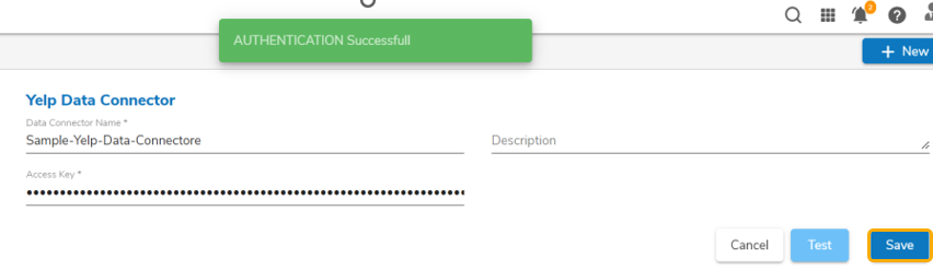The newly created Yelp Data Connector gets added to the Data Connectors List.