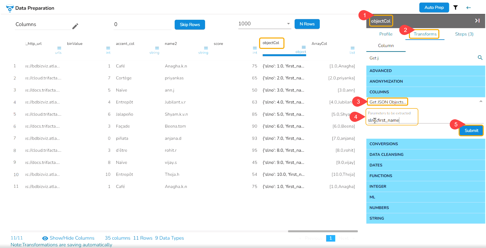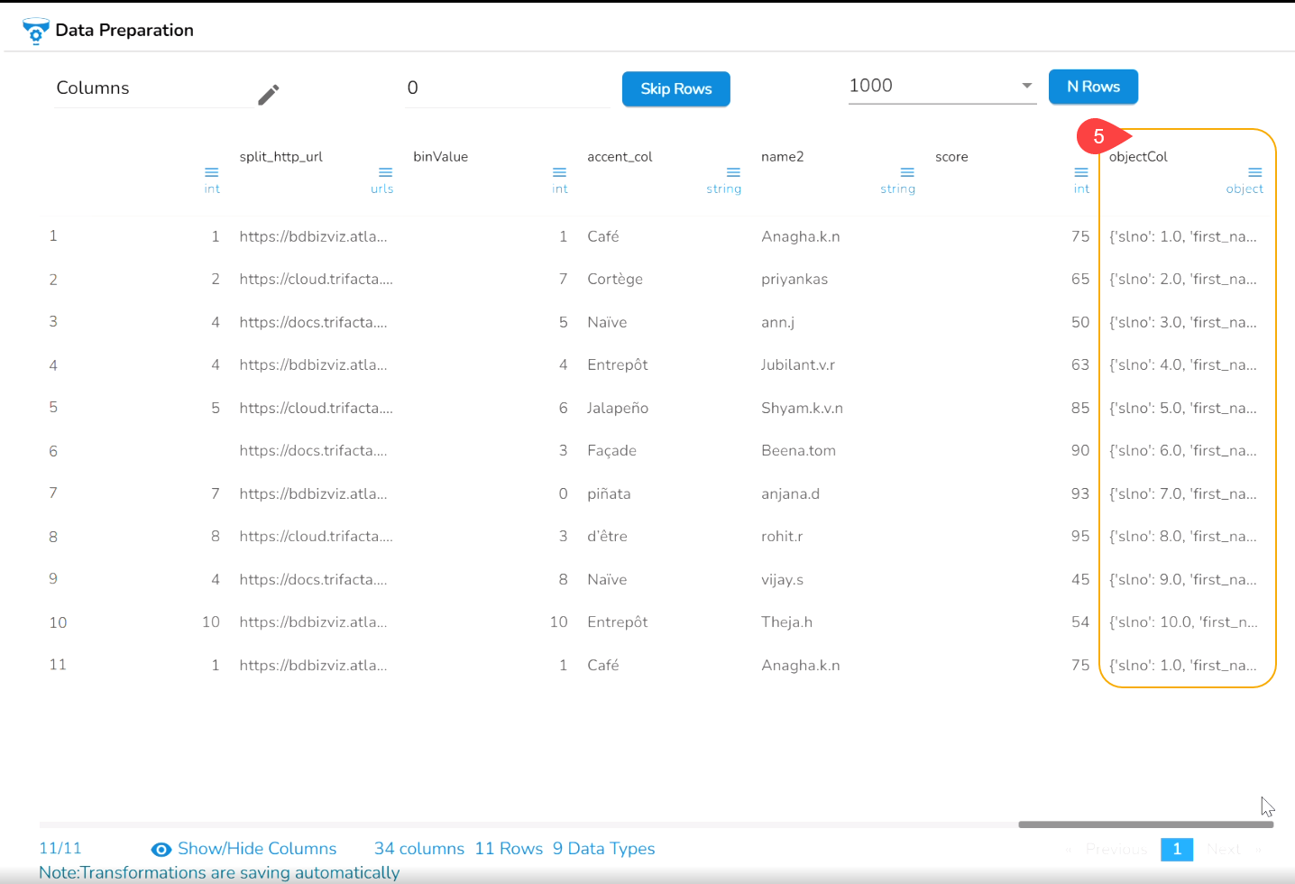 Navigate to the Data Preparation page displaying data grid.
