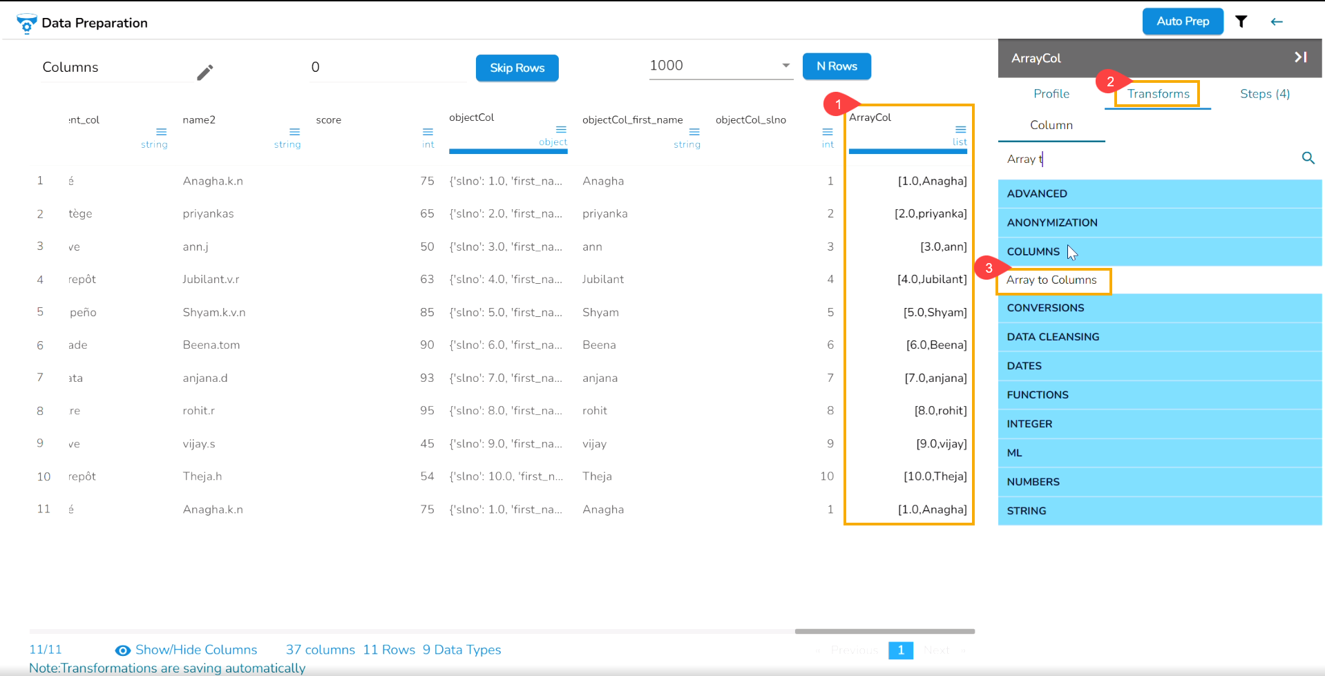Check out the given walk-through on how to use the Array to Column transform.