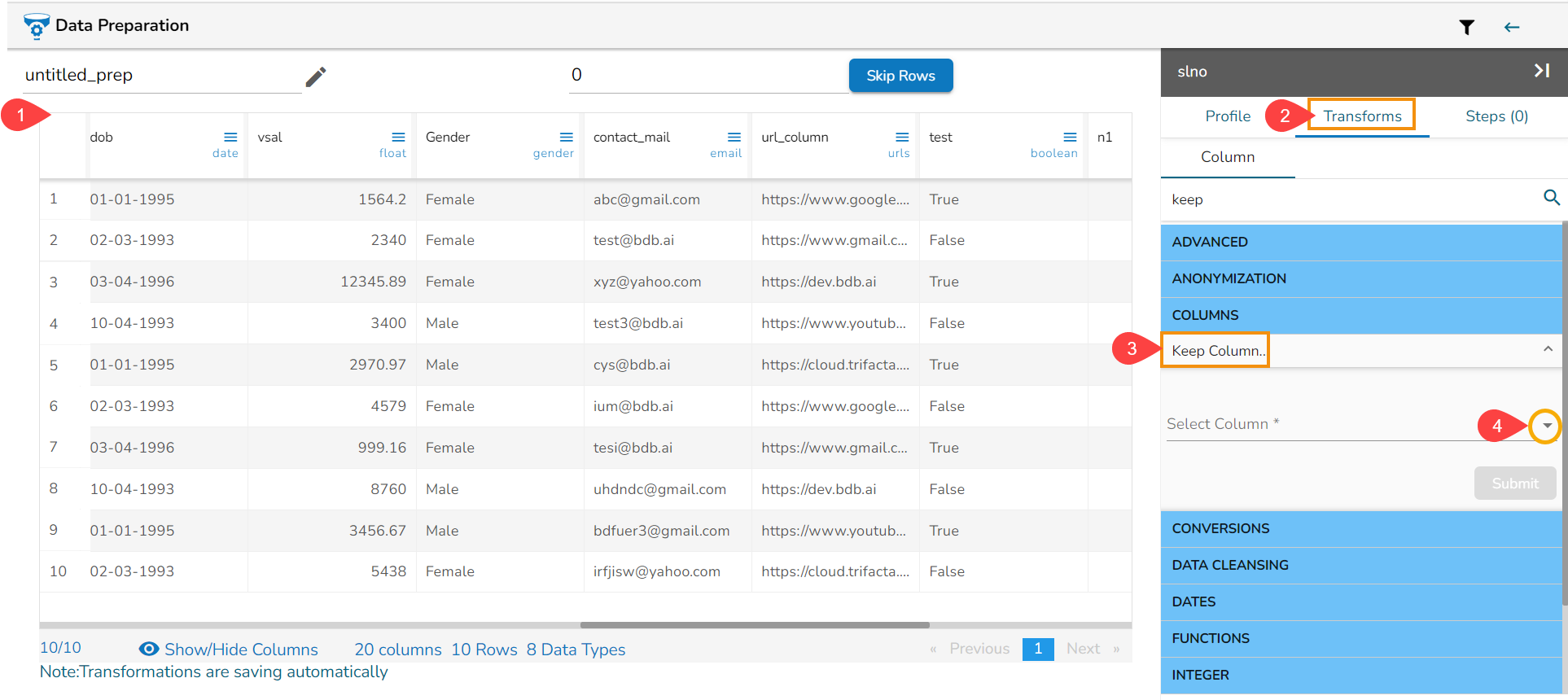 Please Note: If the Sorting transform is used multiple time, the dataset will be ordered based on the last selected sorting order.