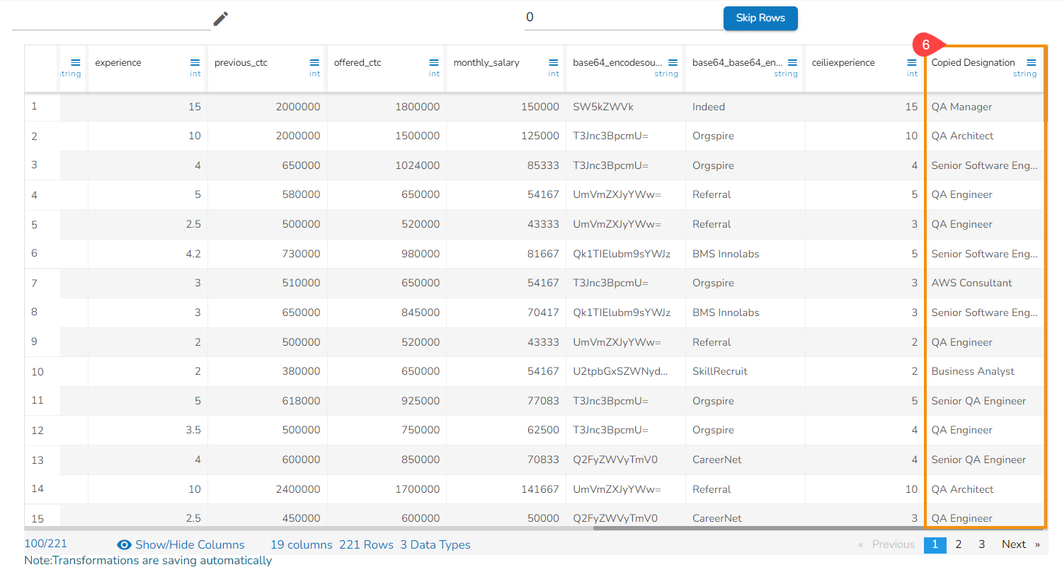 This transform will create a new blank column in the selected data set. The datatype for the newly added blank column will be as None.