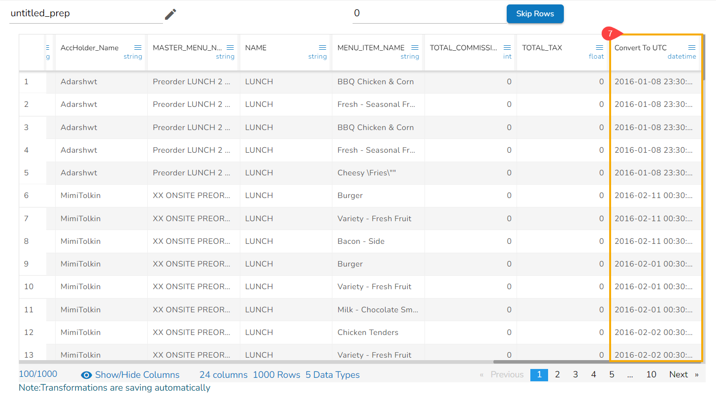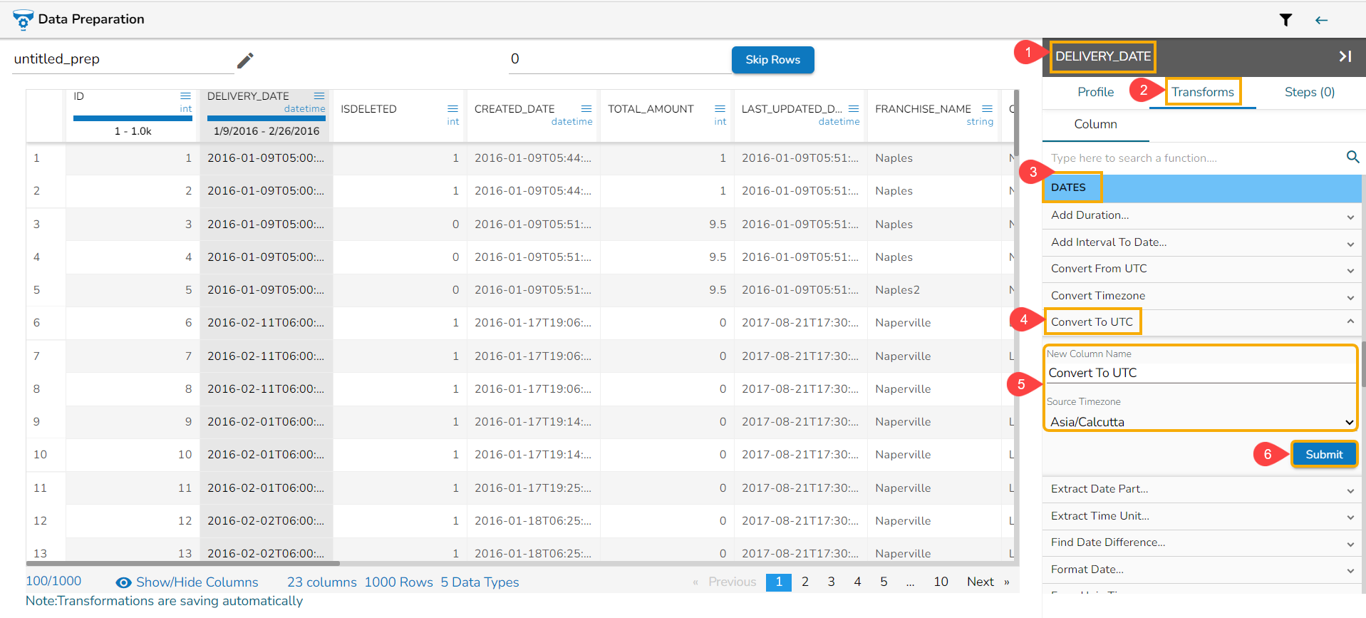 The Convert To UTC transform converts the DateTime value in a specified time zone to the corresponding value in the UTC time zone. Input can be a column of DateTime values.