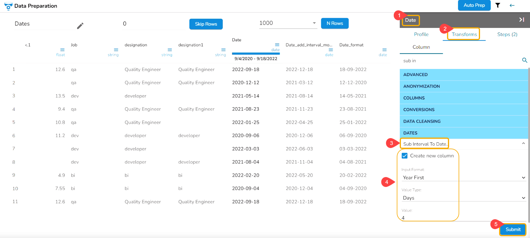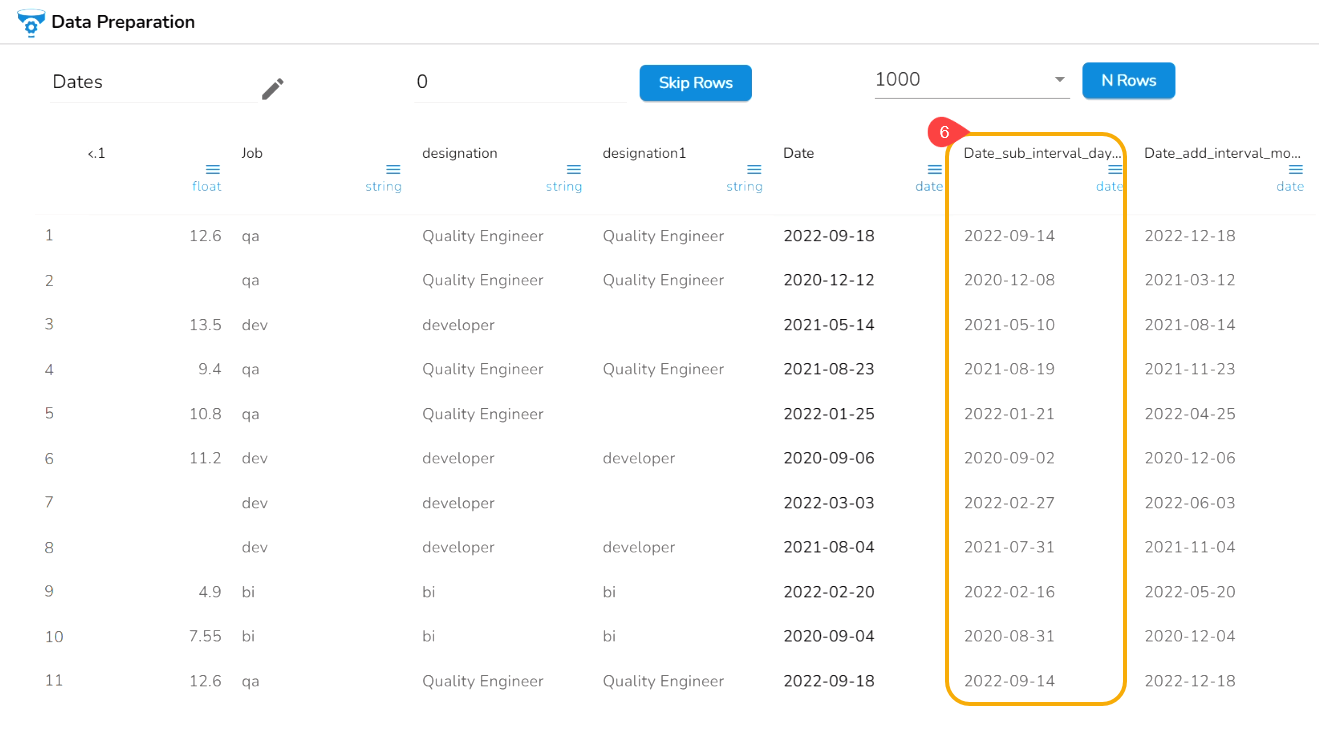 E.g., The Sub Interval to Date transform is applied on the Date column with the 4 days as value to get Sub Interval to the given date.