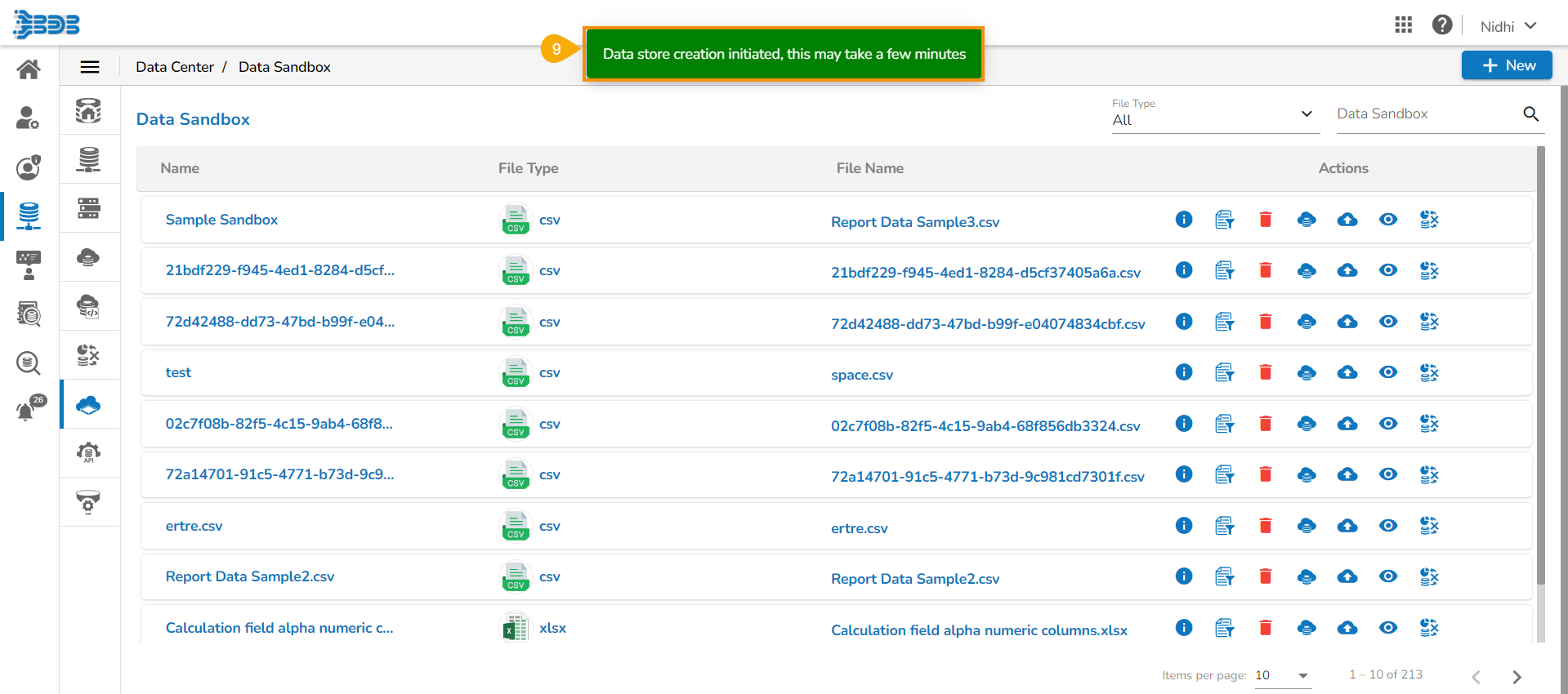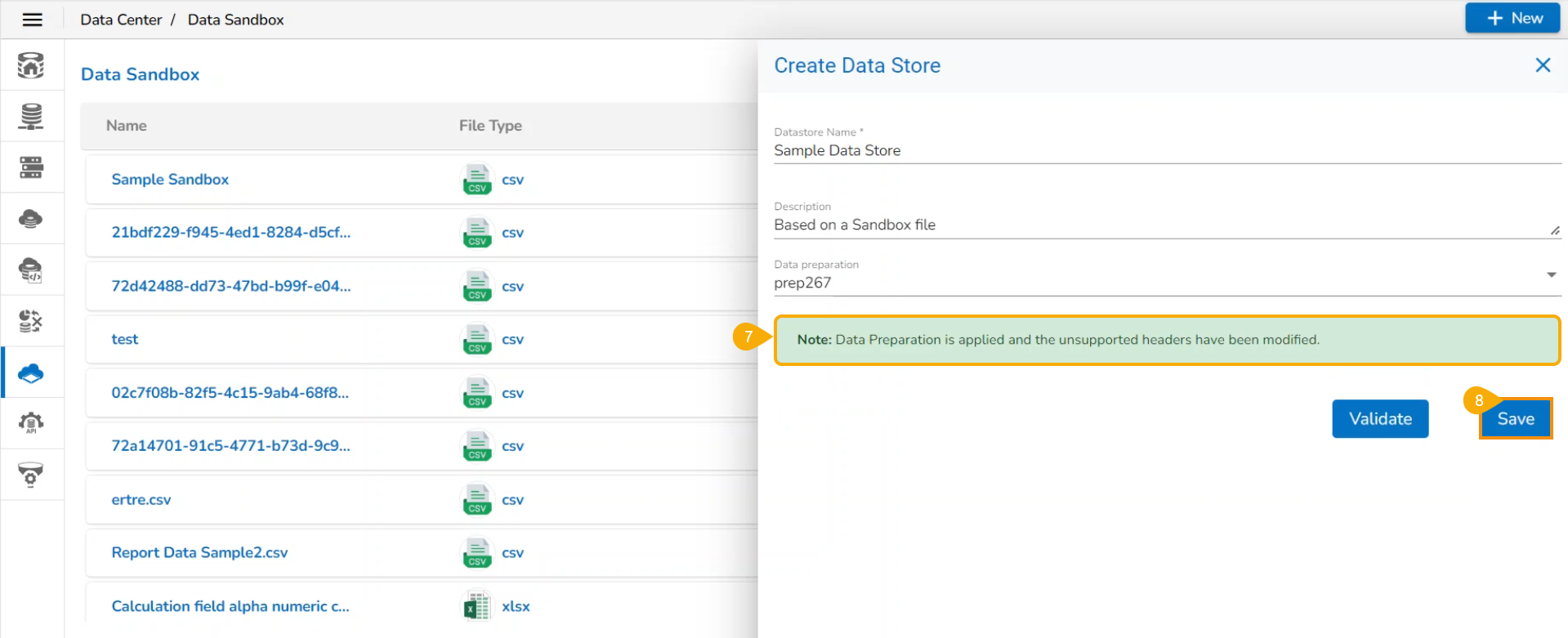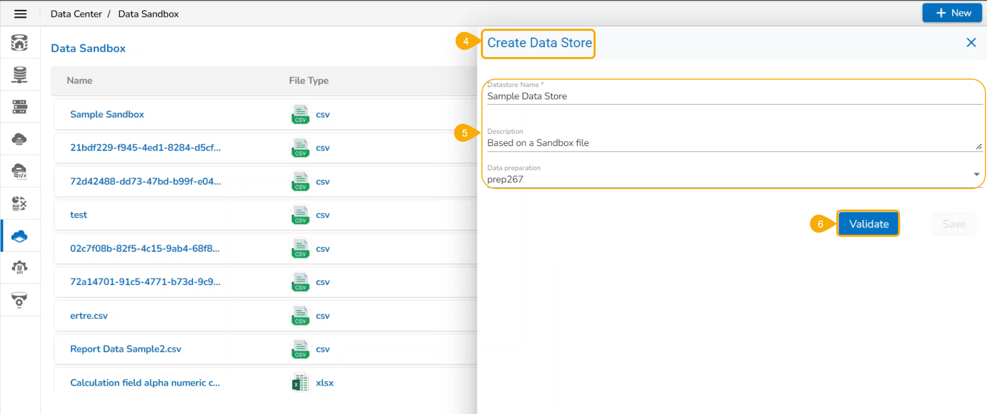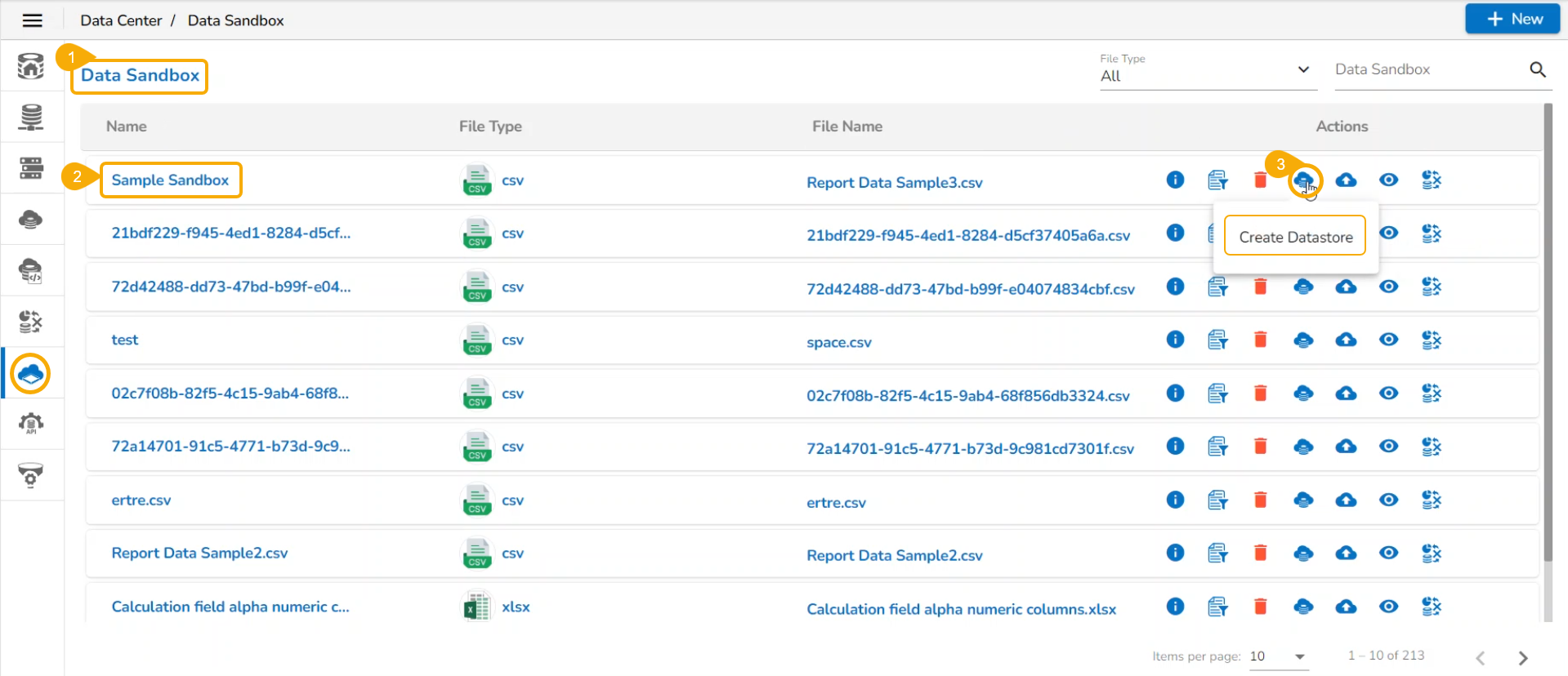 * Click the ***Create Datastore*** icon for the selected Data Sandbox file.