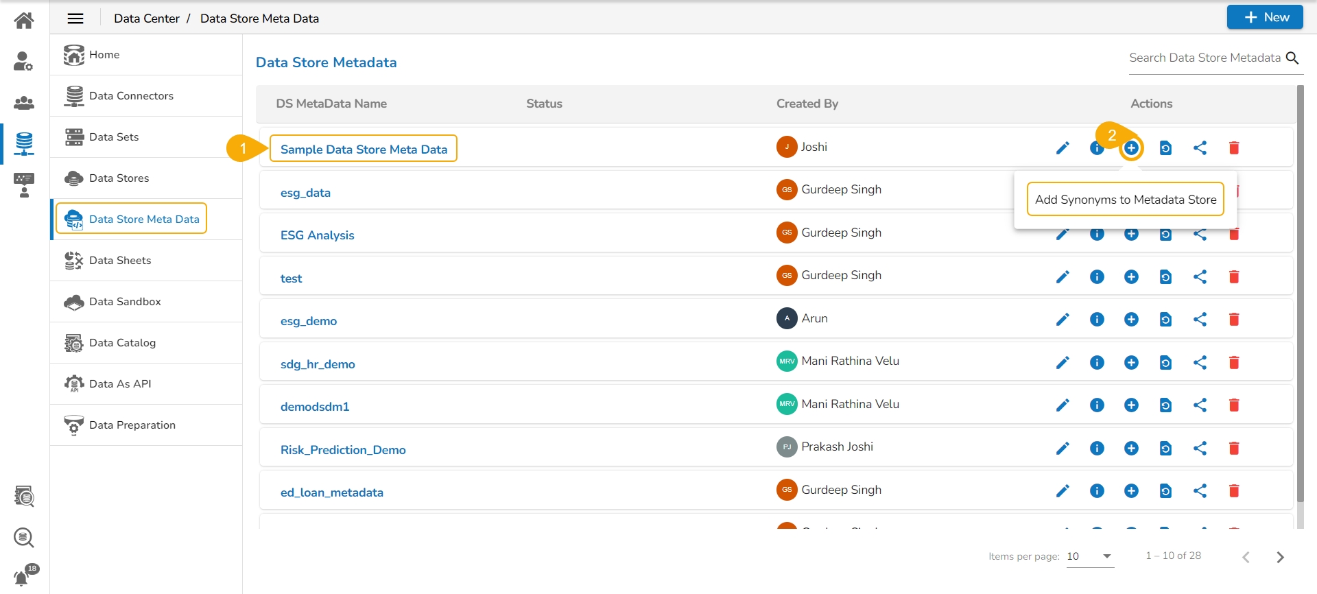 Navigate to the NLP Synonyms window for a data store metadata.