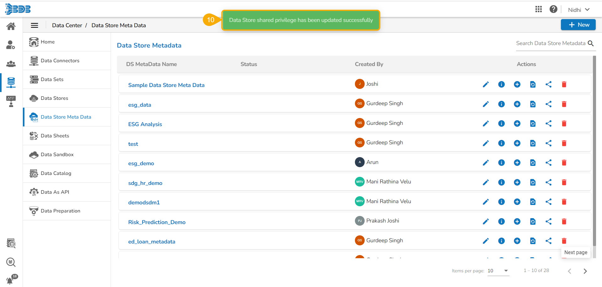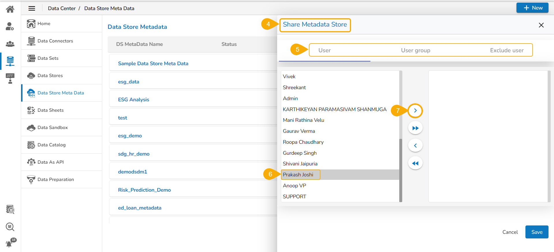 Please Note: By completing the above-mentioned steps, a Meta Data Store gets shared with the selected user/user group, or the selected users can also be excluded from their privileges for the concerned Data Store Meta Data.