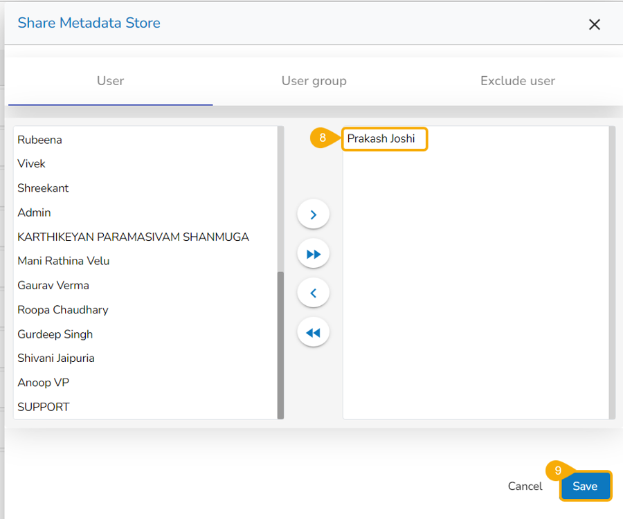 Select an option out of the given choices: User and User Group or Exclude User (The ‘Exclude User’ option can be chosen, if the Metadata Store is already shared with a user/user group and you wish to exclude them from the privilege).
