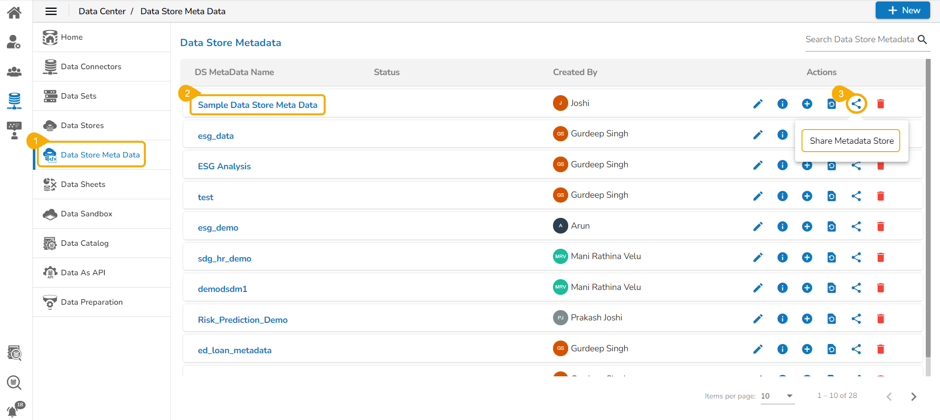 This option allows the user to share the specific Metadata Store from the available list of the Data Store Metadata with other users or user groups.