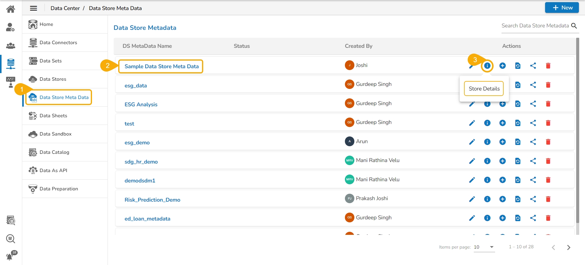 The Meta Datastore Info drawer opens displaying the following details for the selected Metadata Store: