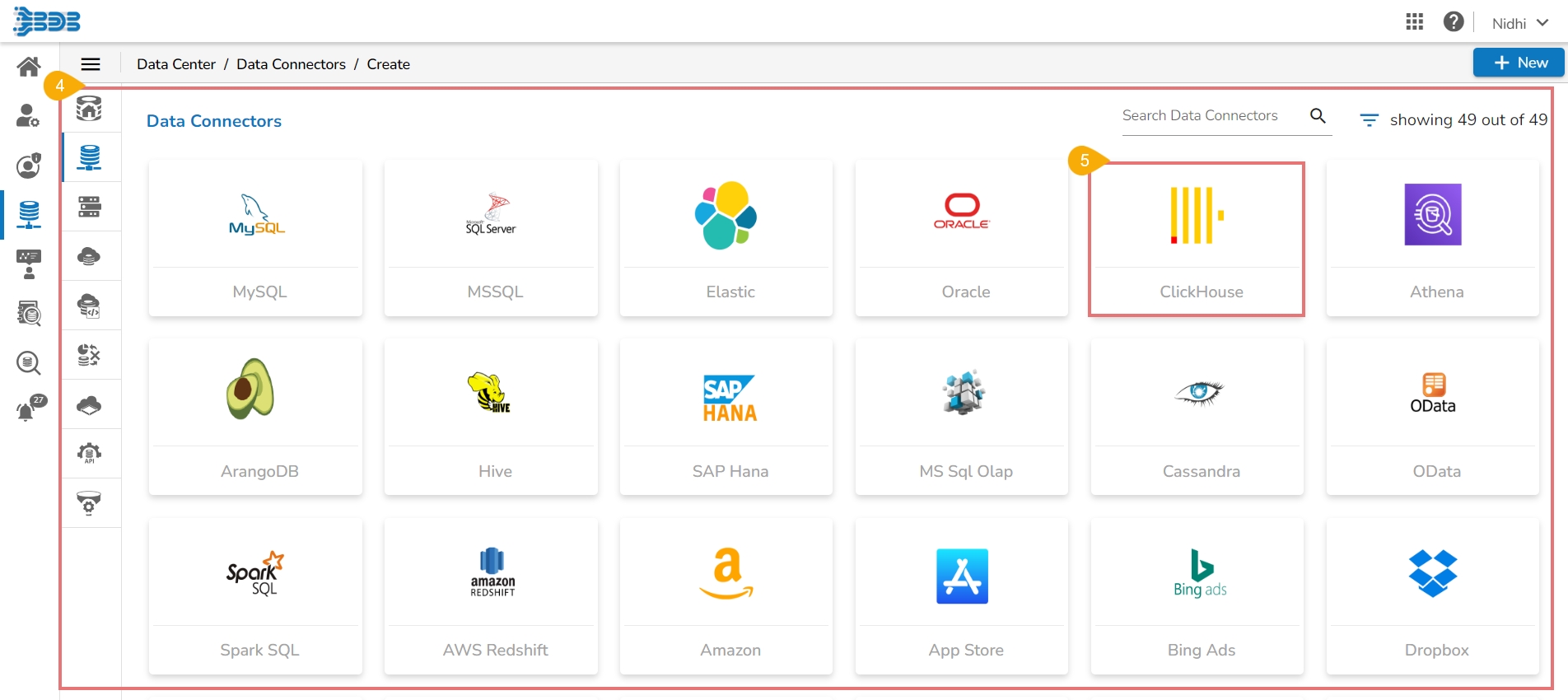 The Data Connectors page gets customized based on the selected category (E.g., the following image displays all the available data connectors from the Database category).