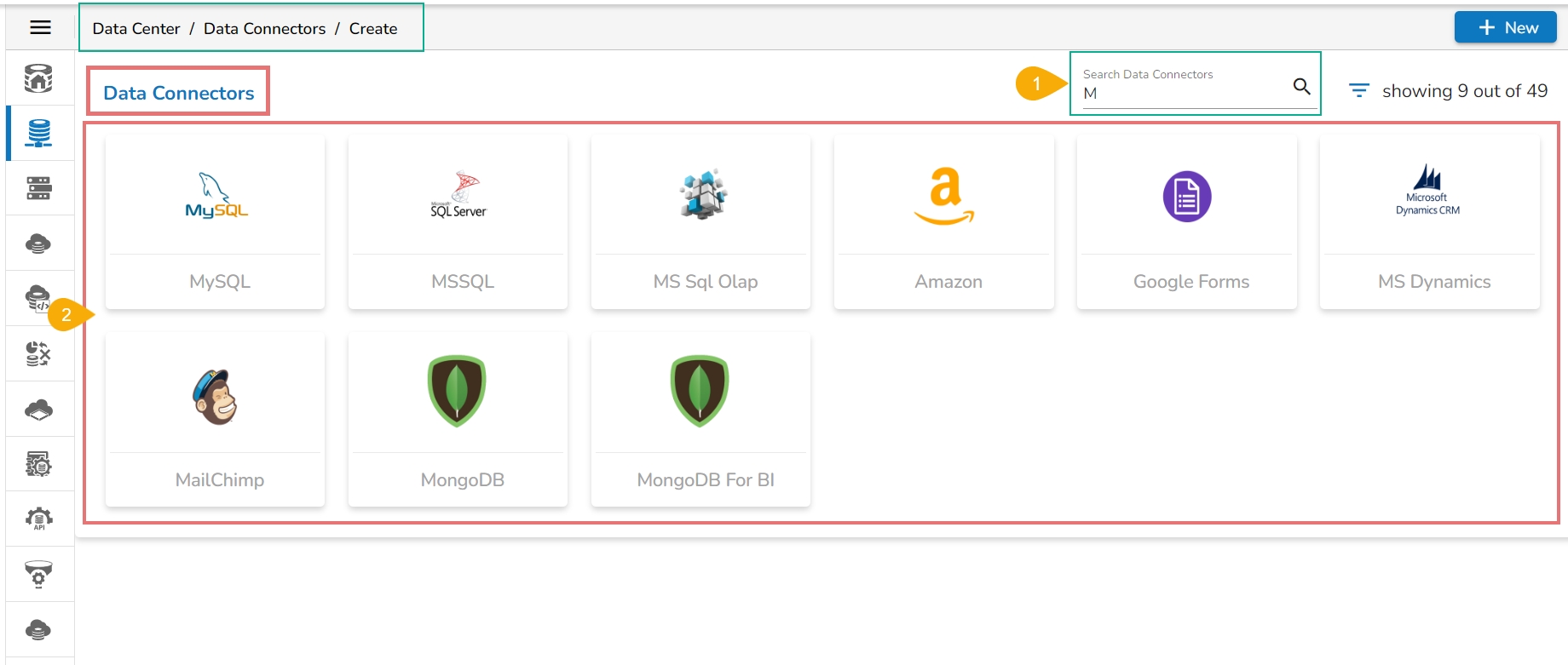 As you start typing based on searched text the Data Connector icons will change. E.g., By typing the letter 'M', all the Data Connector types containing the alphabet 'M' are displayed on the screen.