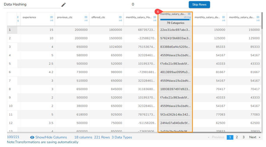 The target column data will be displayed after applying the selected hashing option.