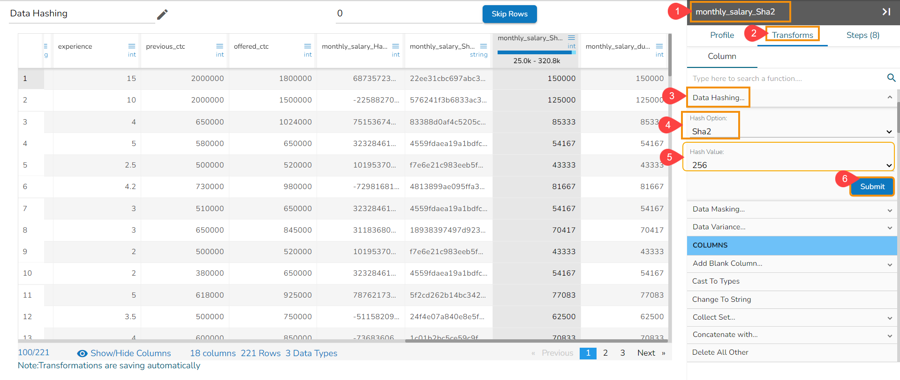 Data in the selected column will be transformed using the hashed format.