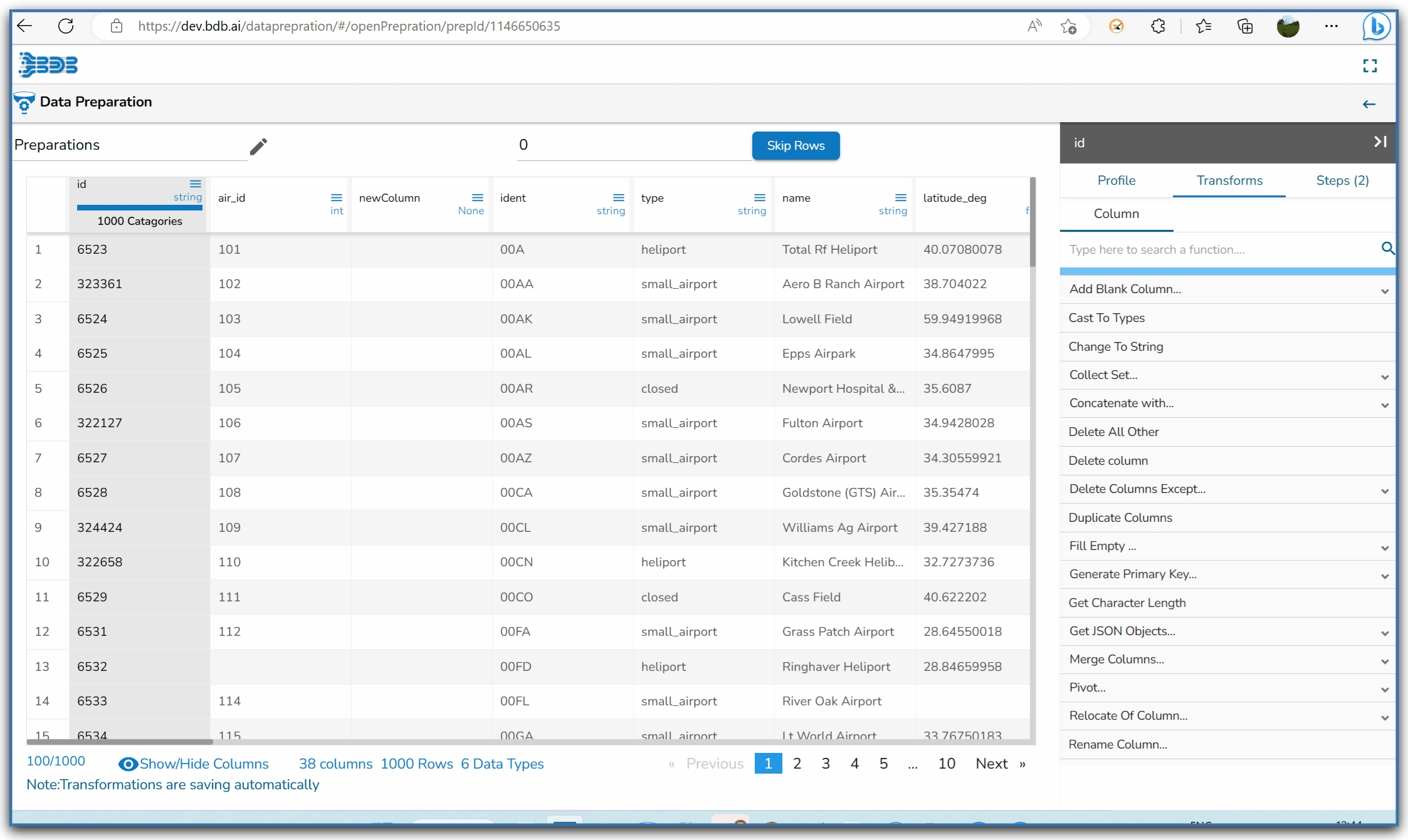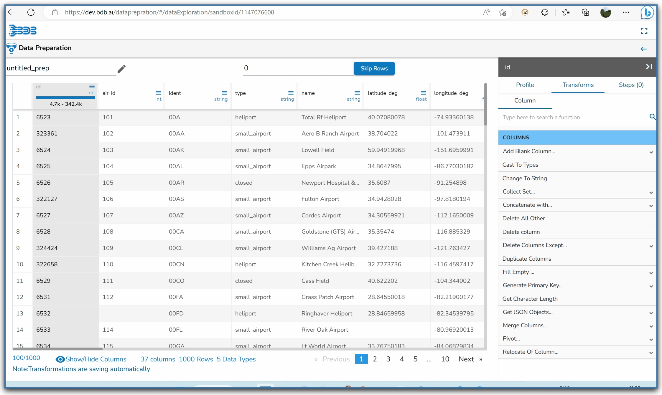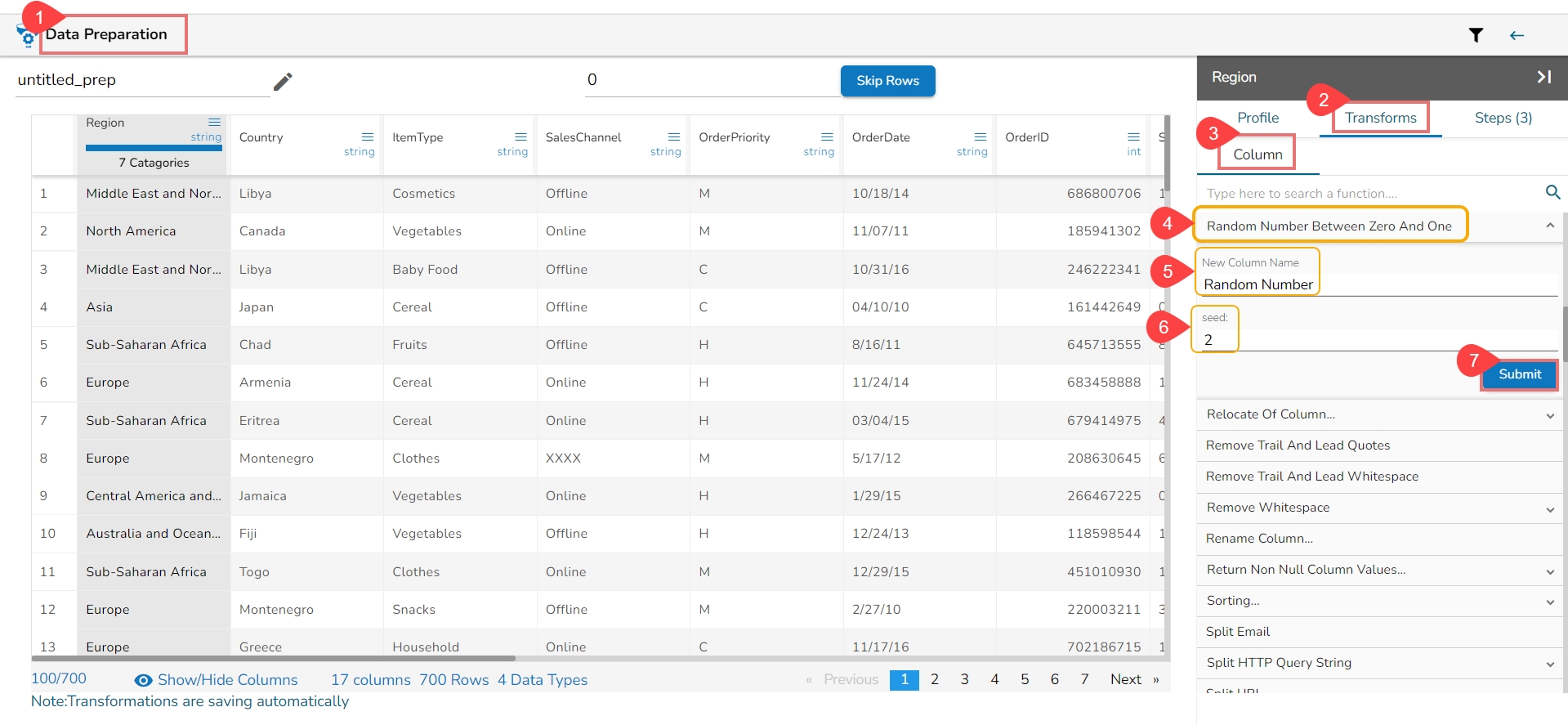 Please Note: If the Sorting transform is used multiple time, the dataset will be ordered based on the last selected sorting order.