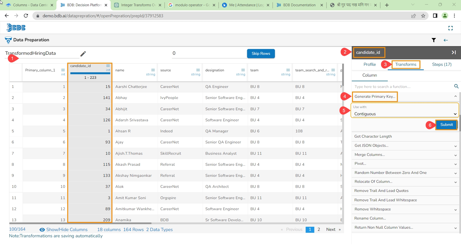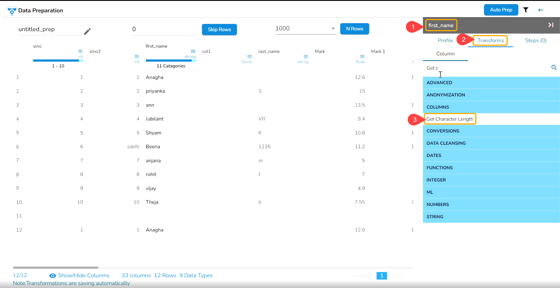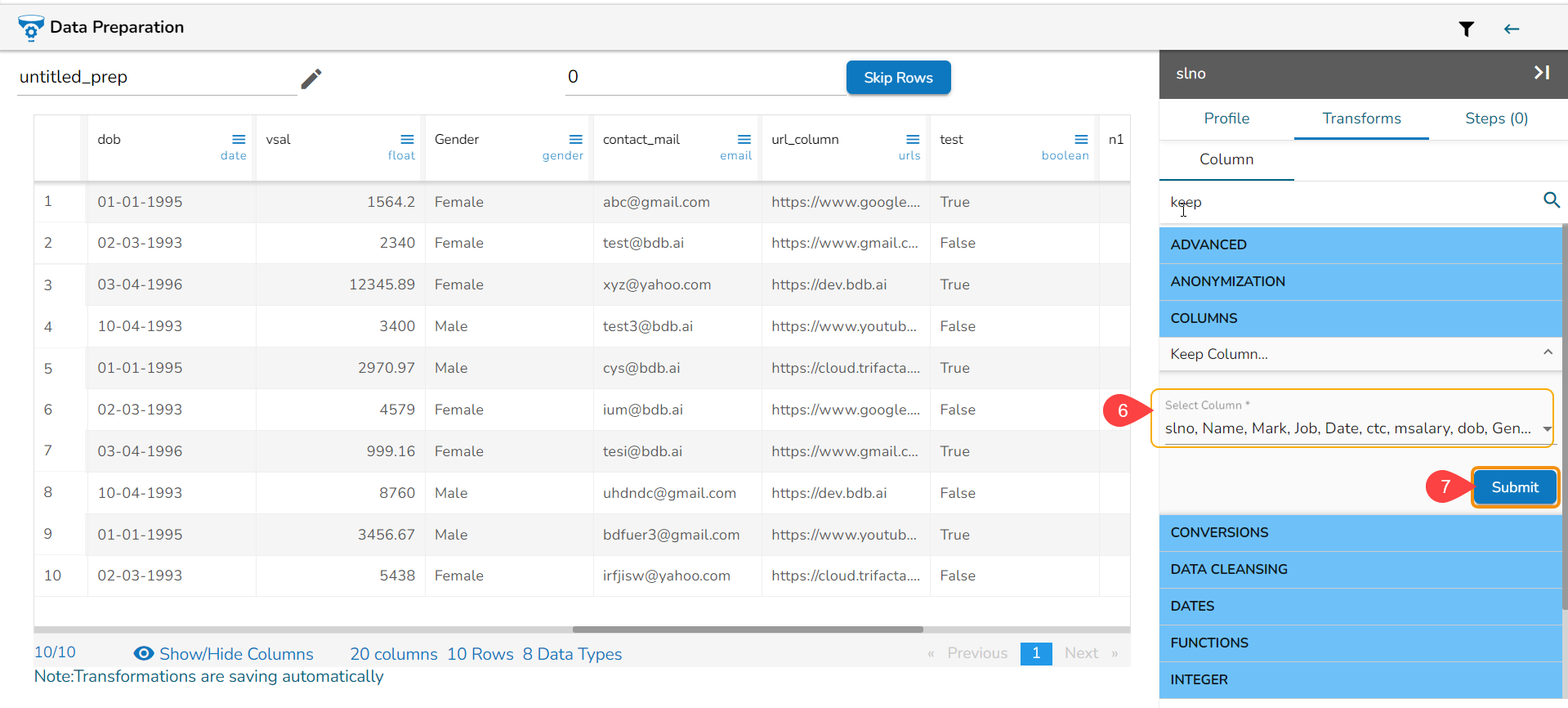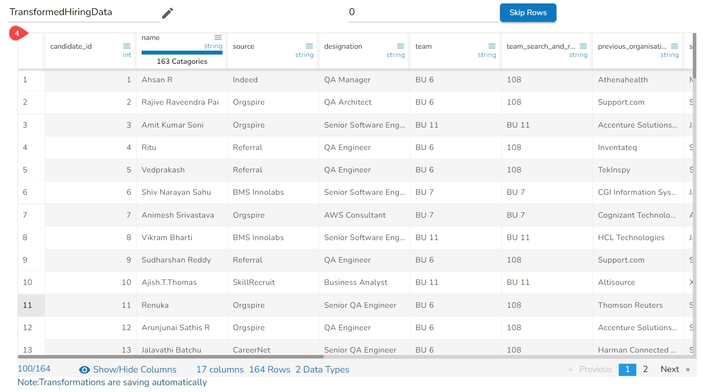 Please Note: If the Sorting transform is used multiple time, the dataset will be ordered based on the last selected sorting order.