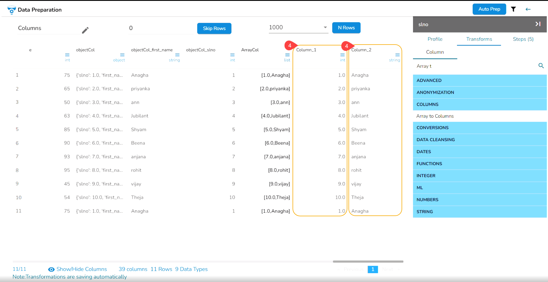 Check out the given walk-through on how to use the Array to Column transform.