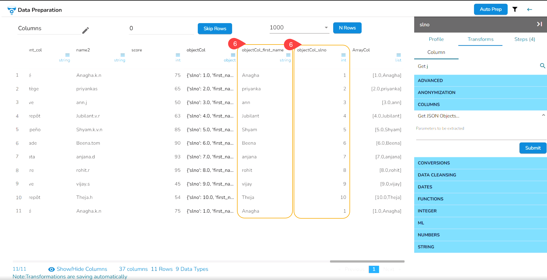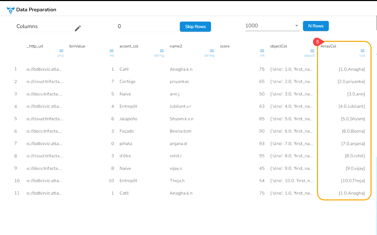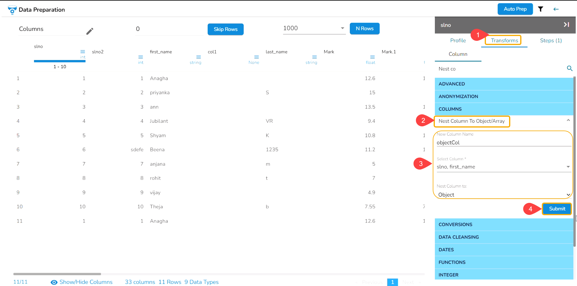 Navigate to the Data Preparation page displaying data grid.
