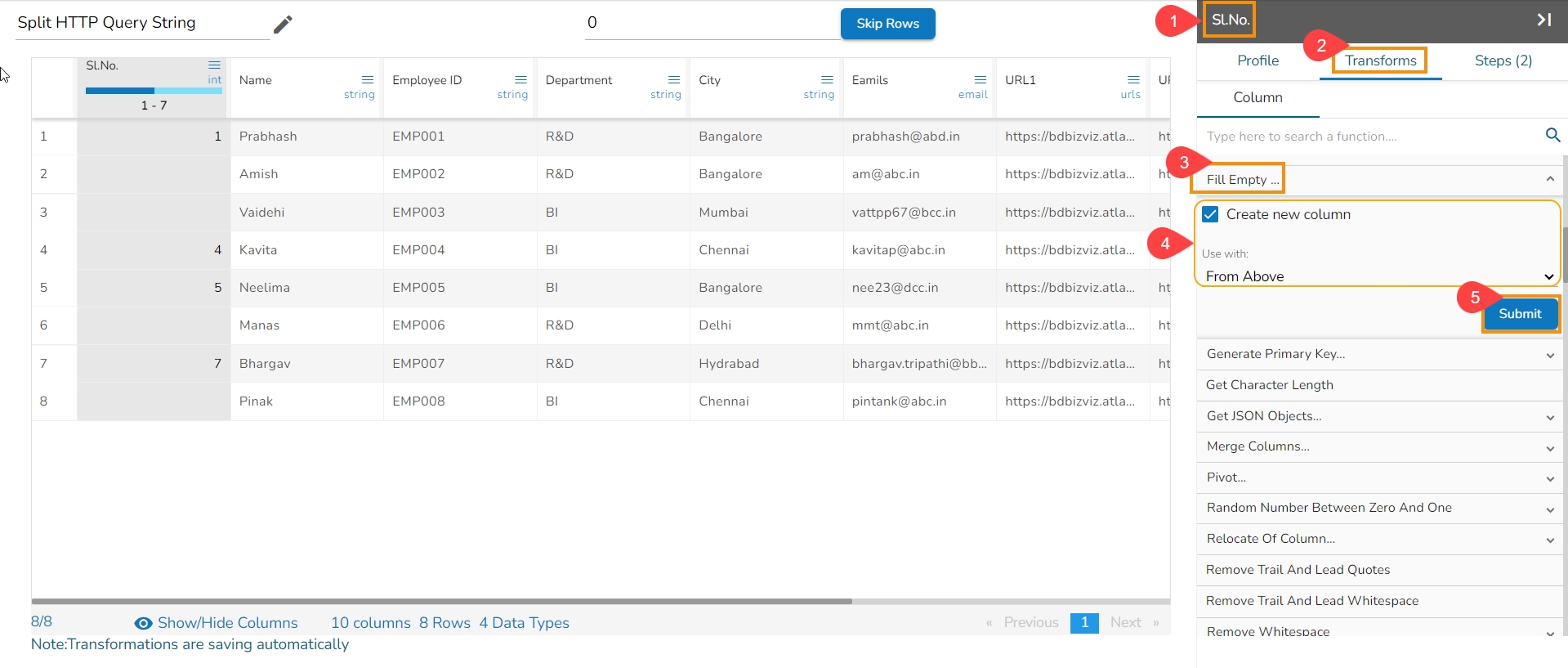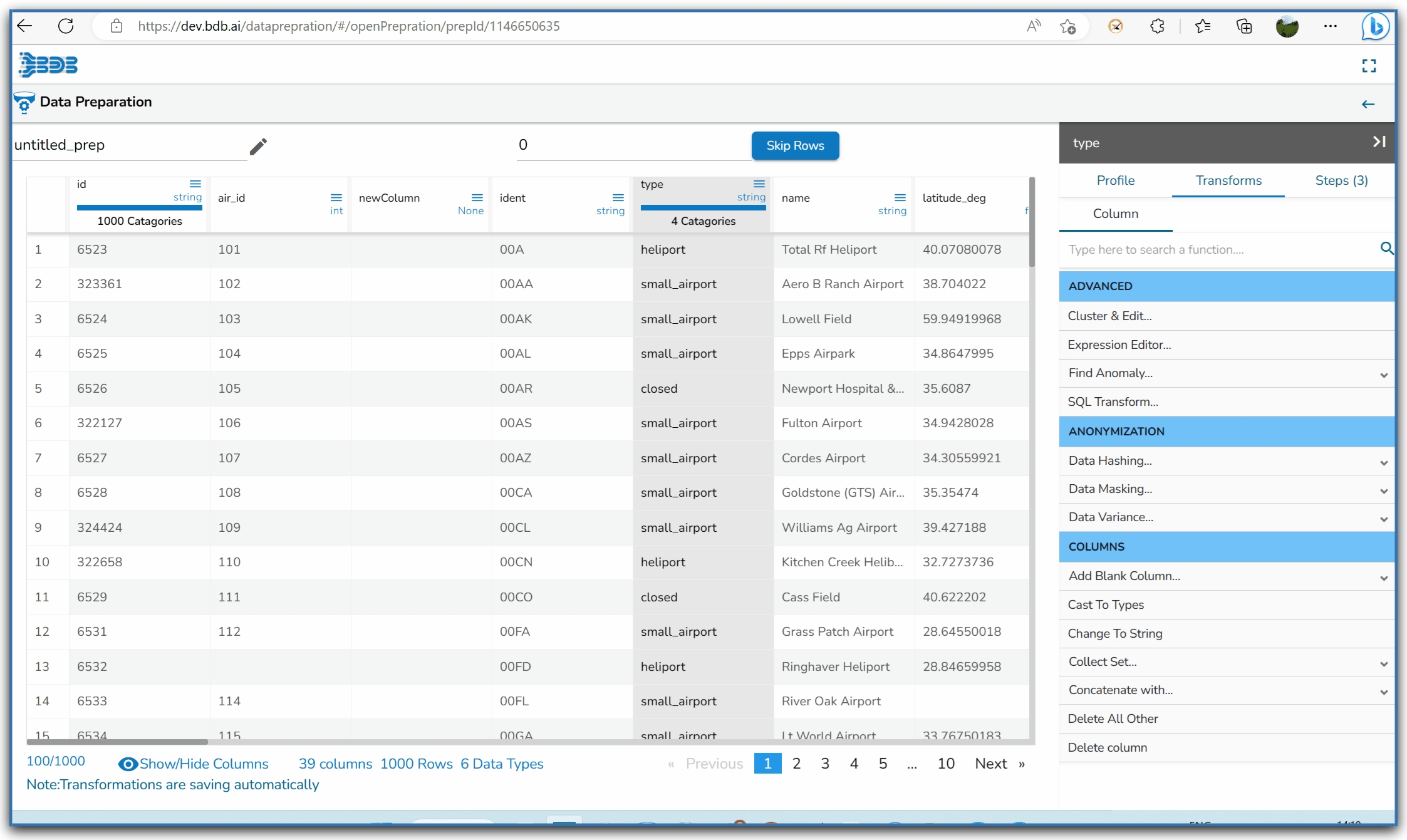 This transform will create a new blank column in the selected data set. The datatype for the newly added blank column will be as None.