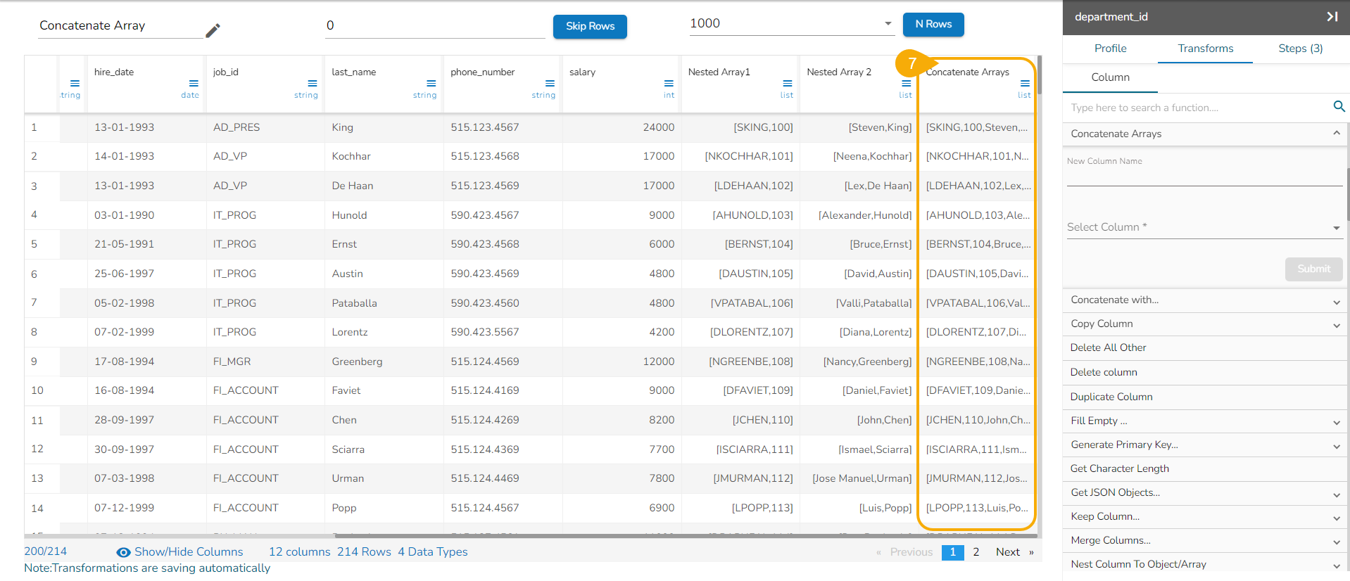 Please Note: The Concatenate Arrays works only upon the List data type columns.