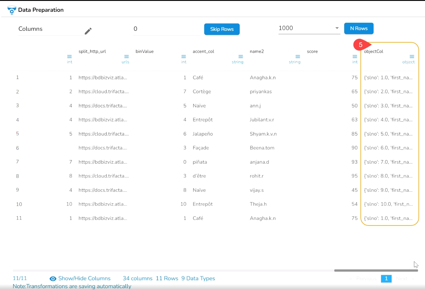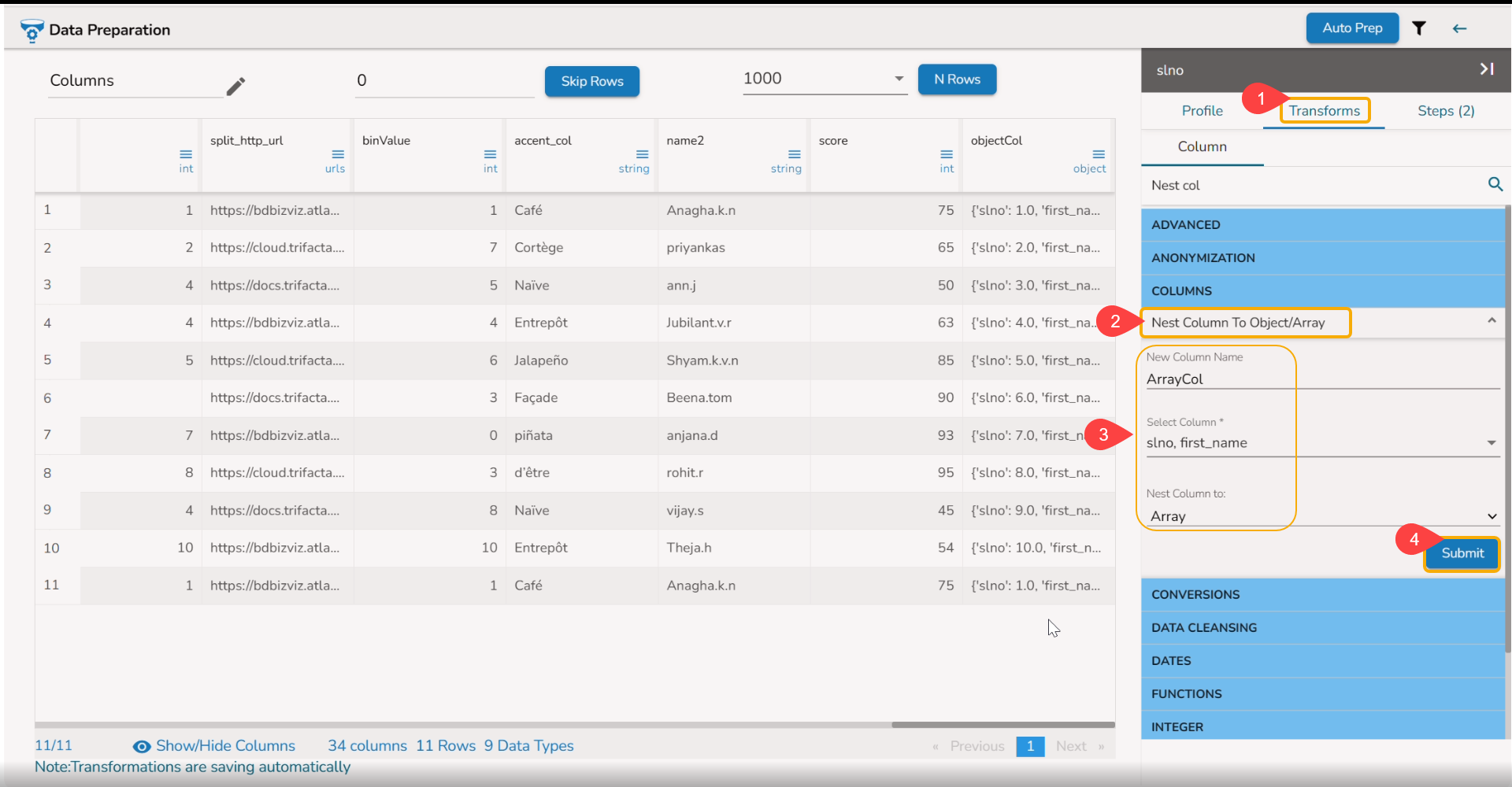 Please Note: The result of the Nest column to Array transformation comes as list datatype & this datatype is not supported while loading the data in the datastore.