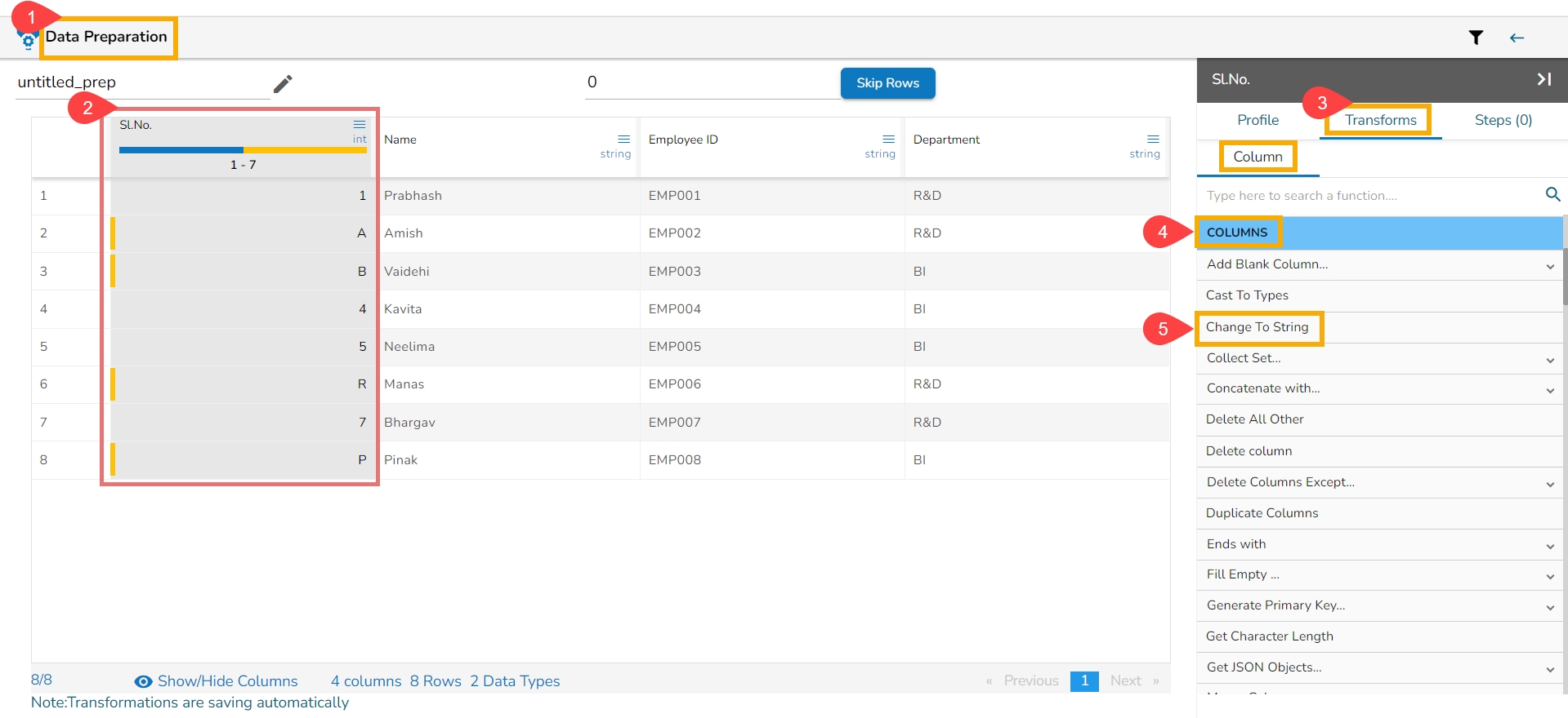 • The Change To String transform can also be accessed by using the menu icon provided for the each column in the Data Grid display of the dataset.
