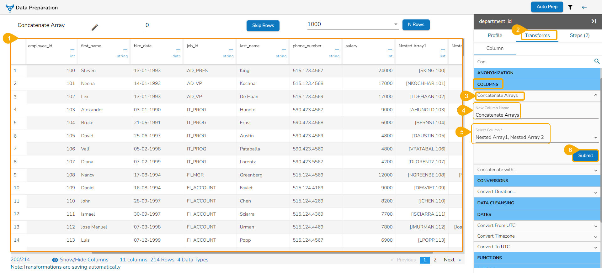 Navigate to the Concatenate Arrays transform from the COLUMNS category.