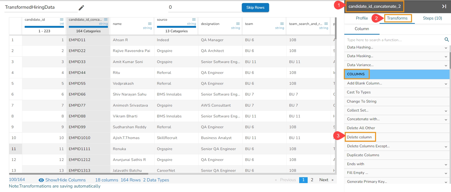 Some of the Column transforms can be accessed by using the Menu icon provided for each column in the Data Grid display of the dataset.​​​