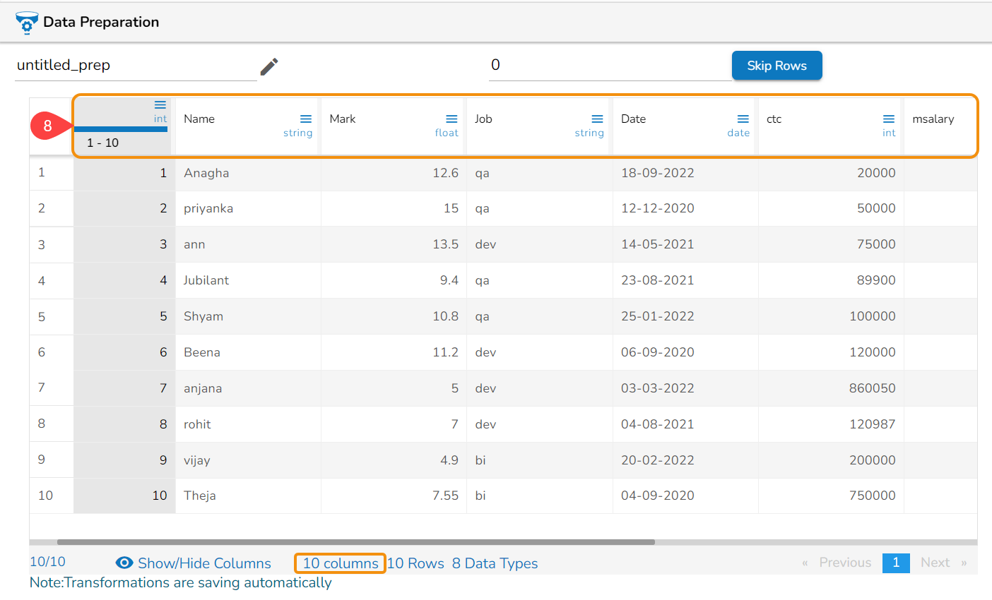 Navigate to the Data Preparation displaying data grid.