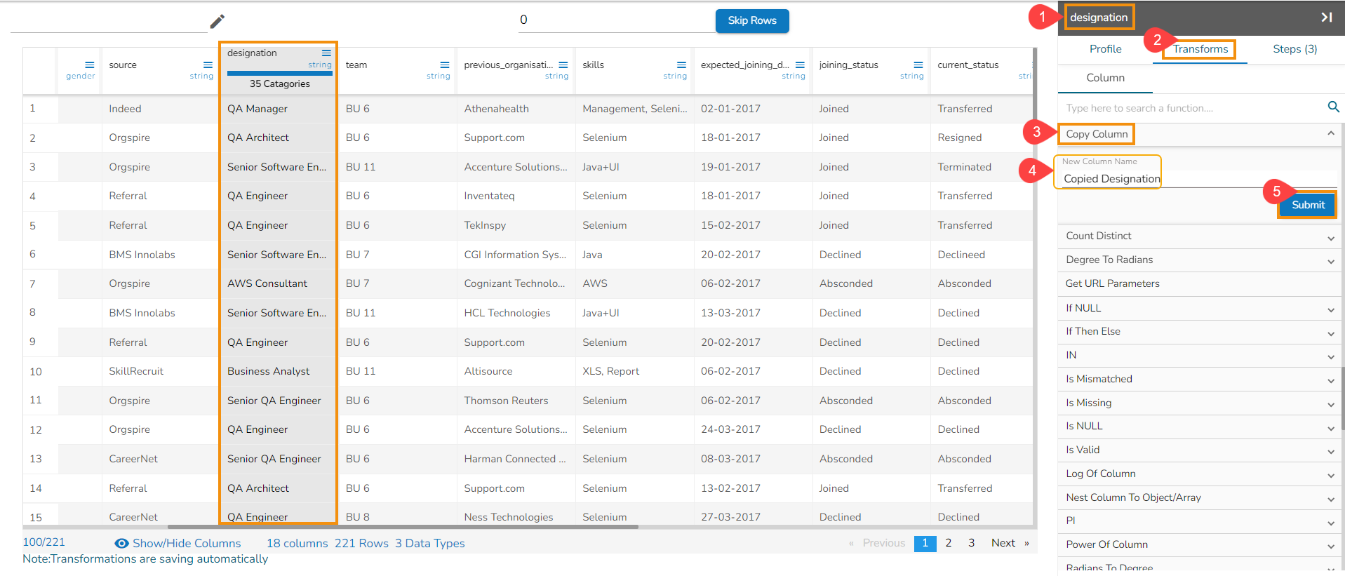 Steps to perform the Relocate of Column transform: