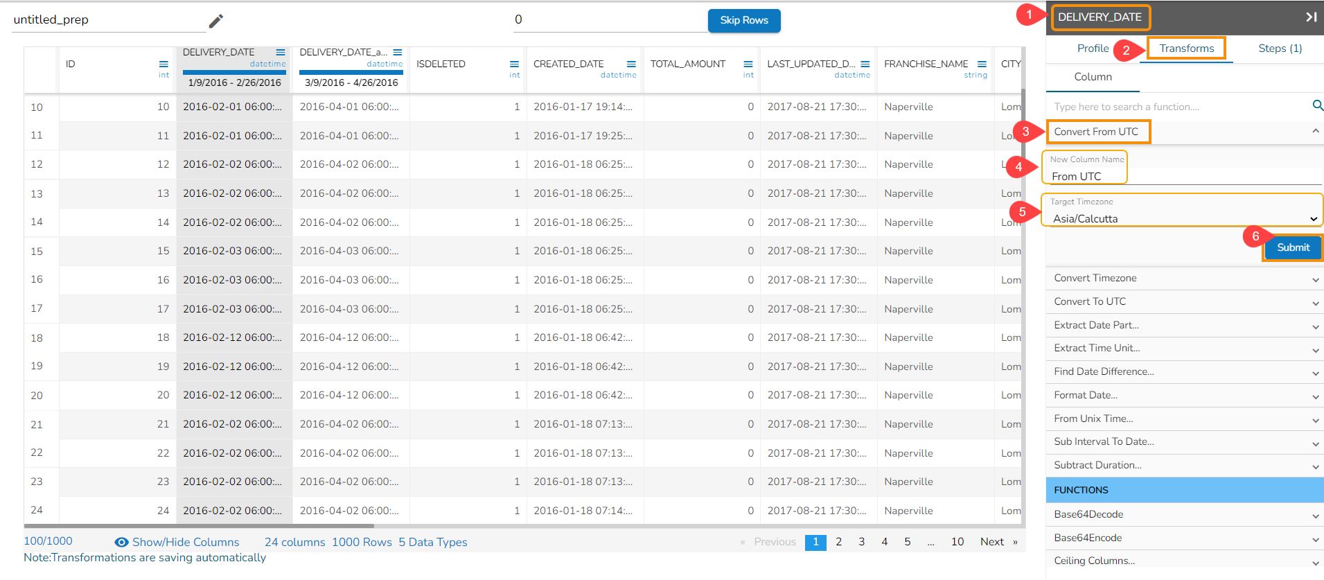 The Extract Time Unit transform is applied to the DELIVERY_DATE column selecting all the available format types: