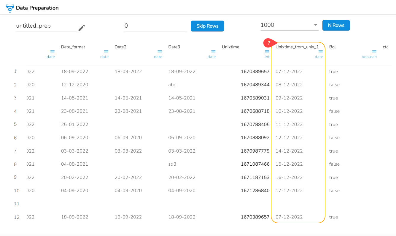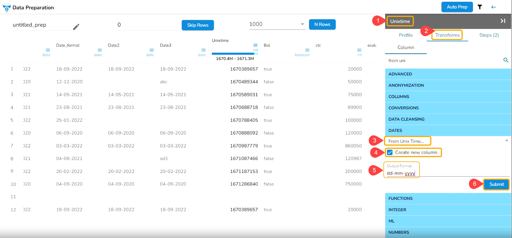 The From Unix Time transform converts the Unix time into a specified format. The From Unix Time transform has been applied on the Date column that contains the values in the Unix format.