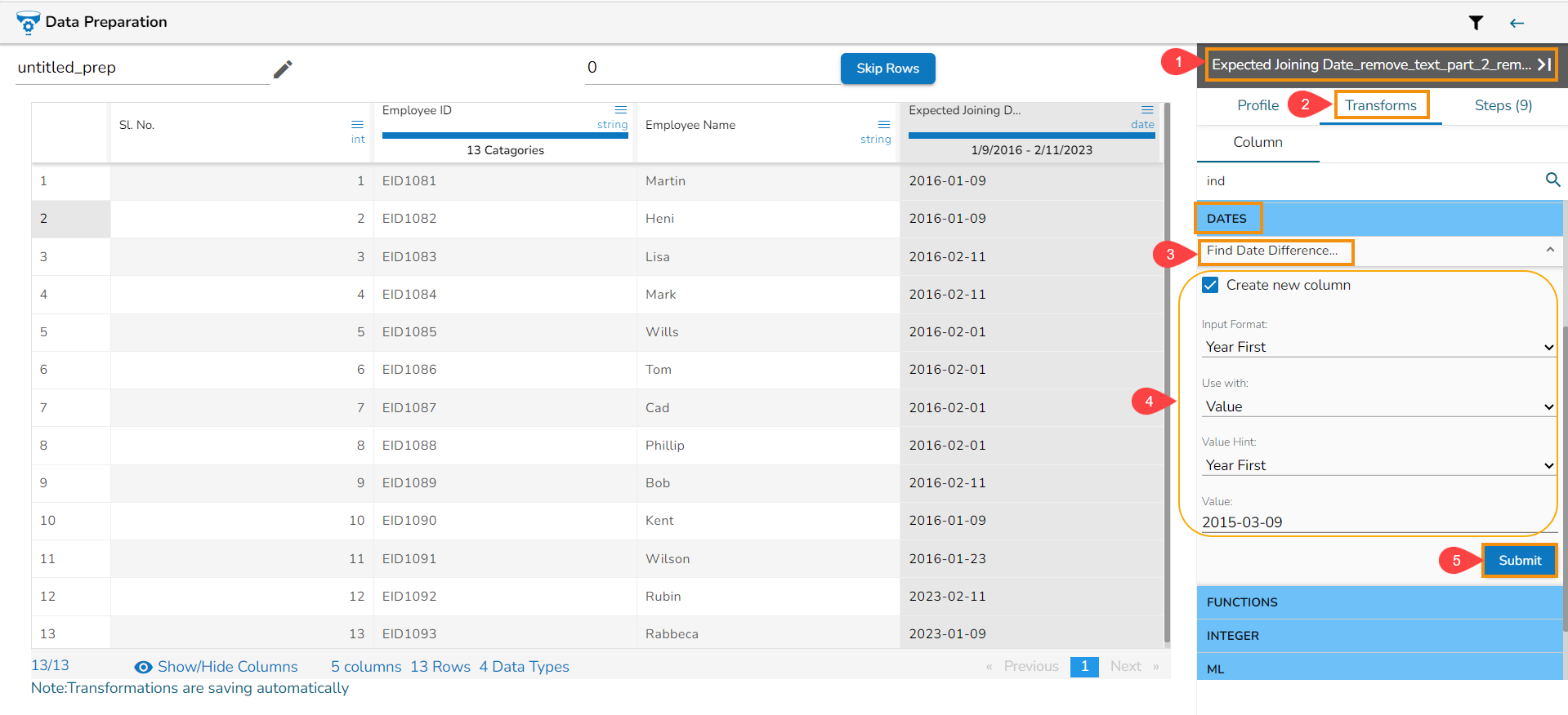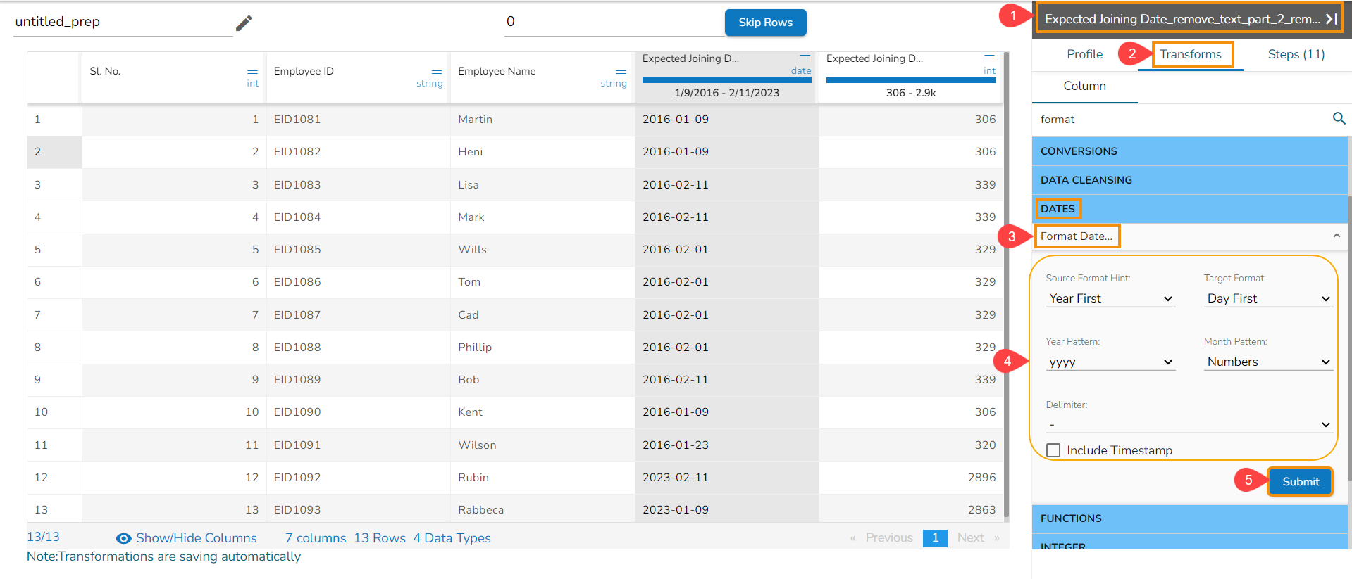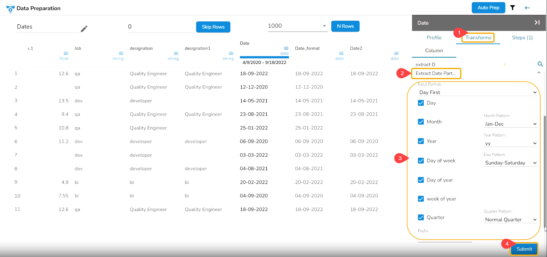 Click the Submit option after selecting all the Date Parts that you wish to extract from the targeted column.
