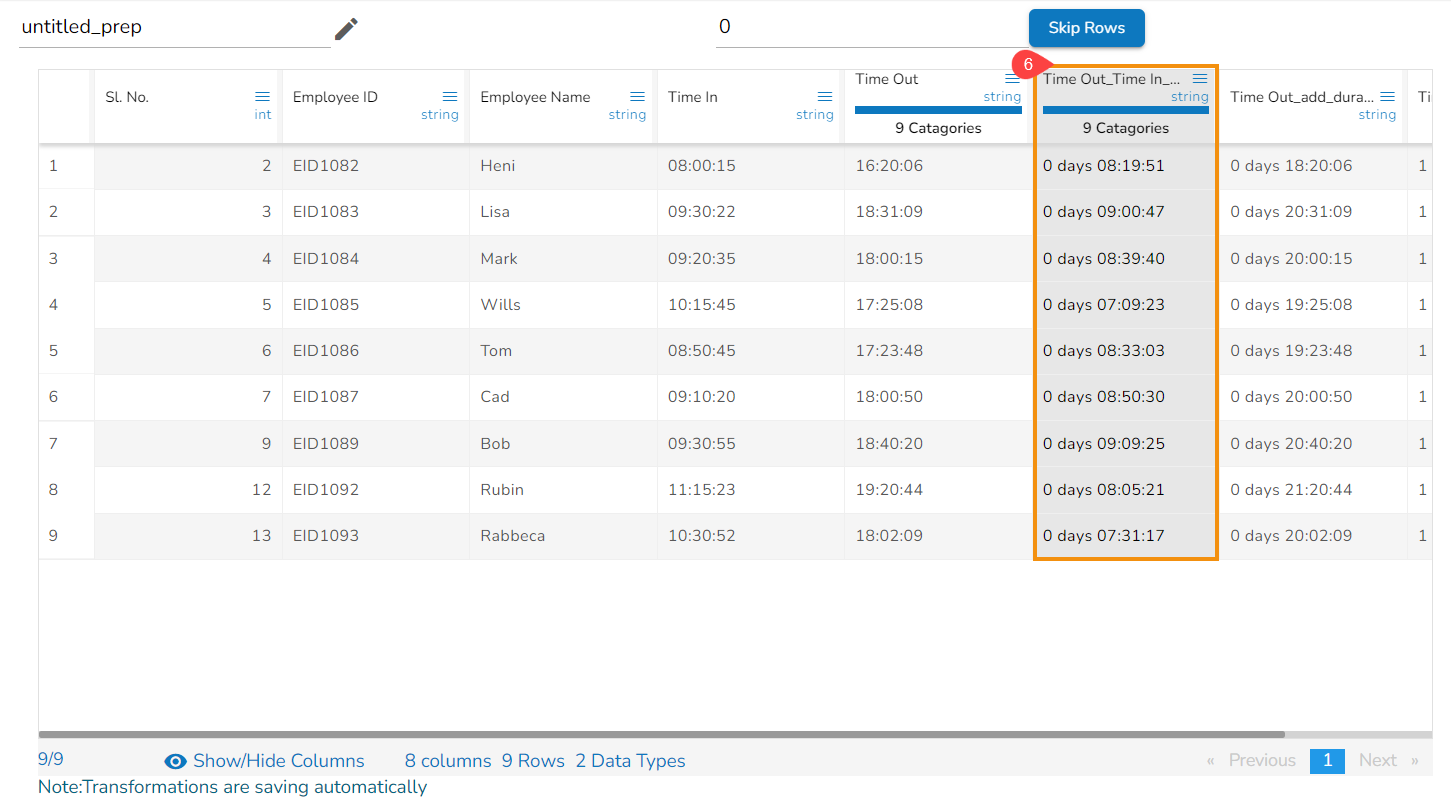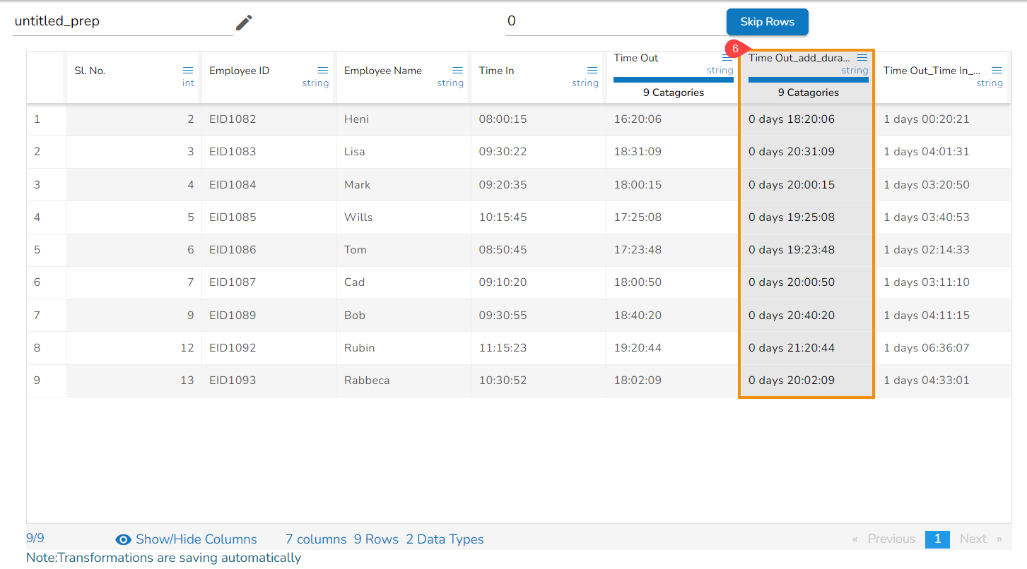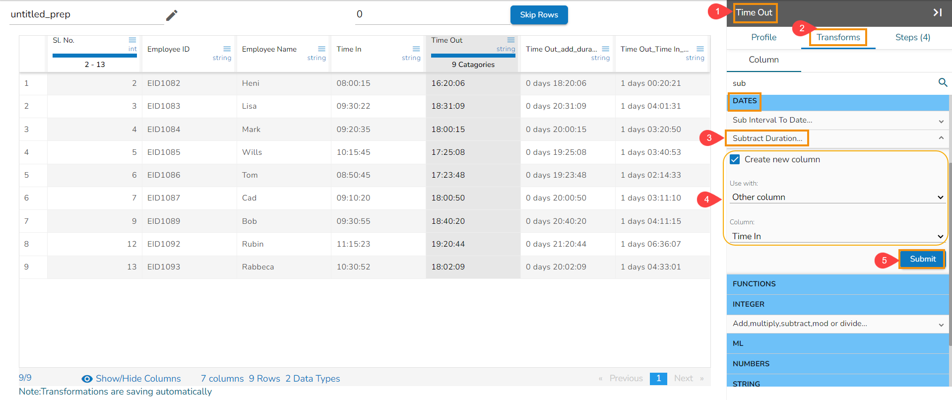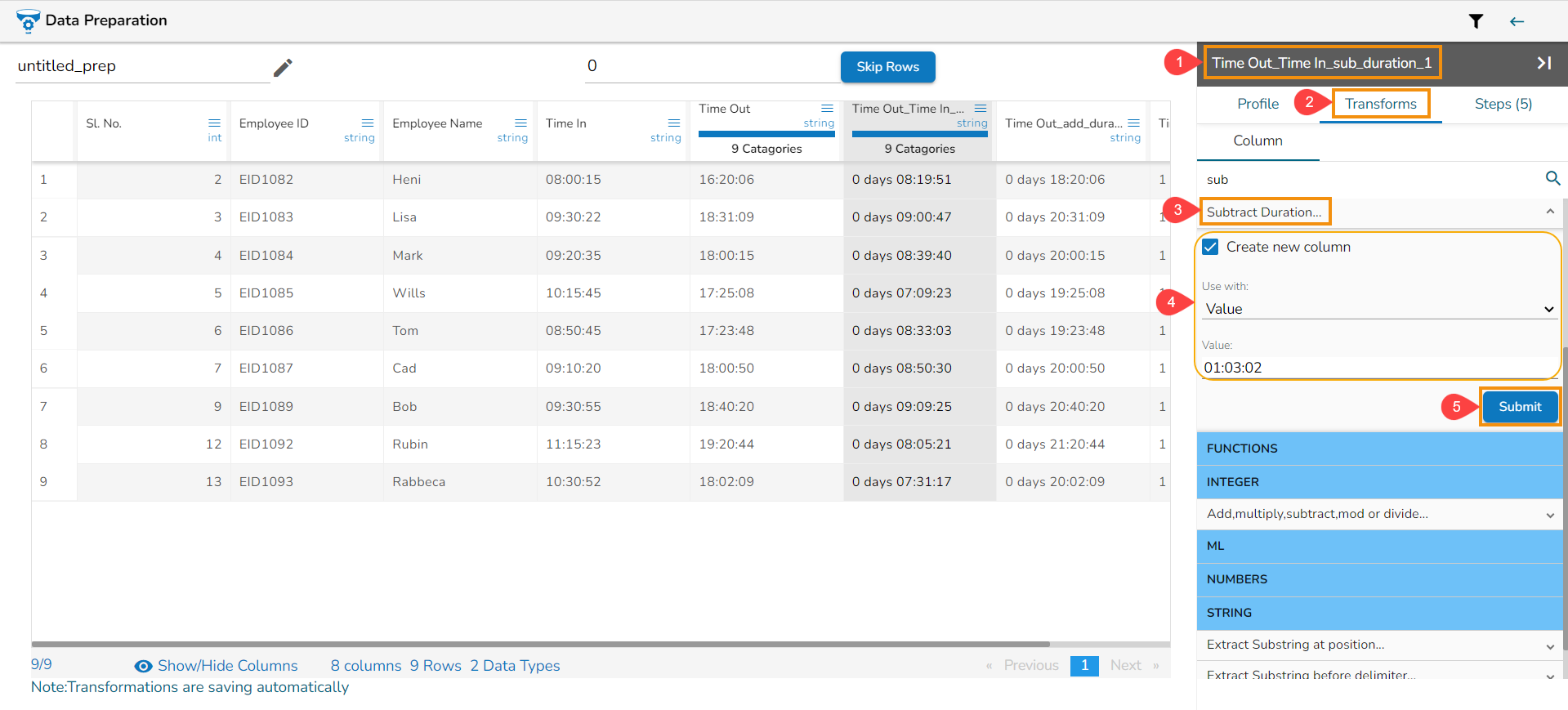The Subtract Duration transform has been applied to the Time Out_Time In_sub_duration_1, the selected value is 01:03:02,