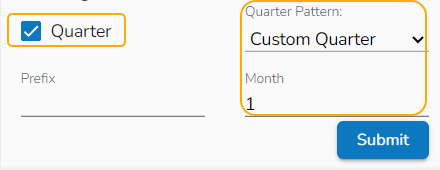 Quarter: It displays the date value based on the quarter, select a quarter pattern using the drop-down option. The supported options are Normal Quarter, Financial Quarter, and Custom Quarter (the user can define the month value for the custom quarter option).