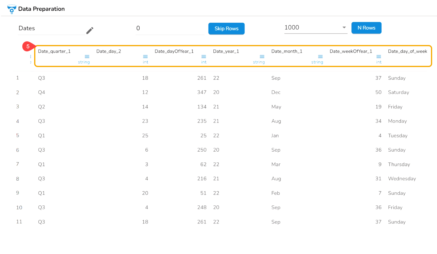 As a result, the time gets extracted in the set time units and no. of columns get added based on the selected time unit options. E.g., In this case, 5 new columns get added to the Data Grid displaying the extracted time values.