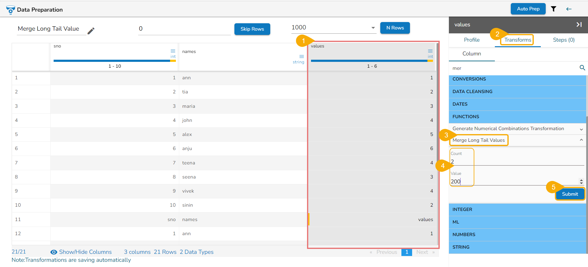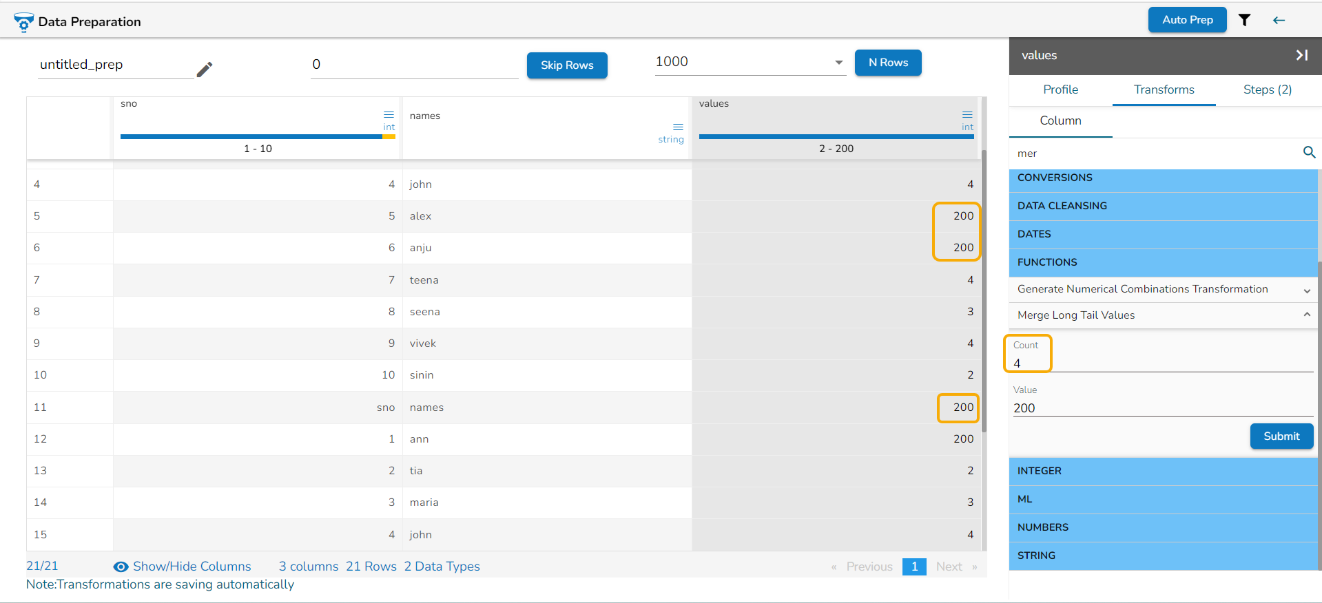 Please Note: The users can select multiple columns as Group By columns while applying the Count Distinct transform.