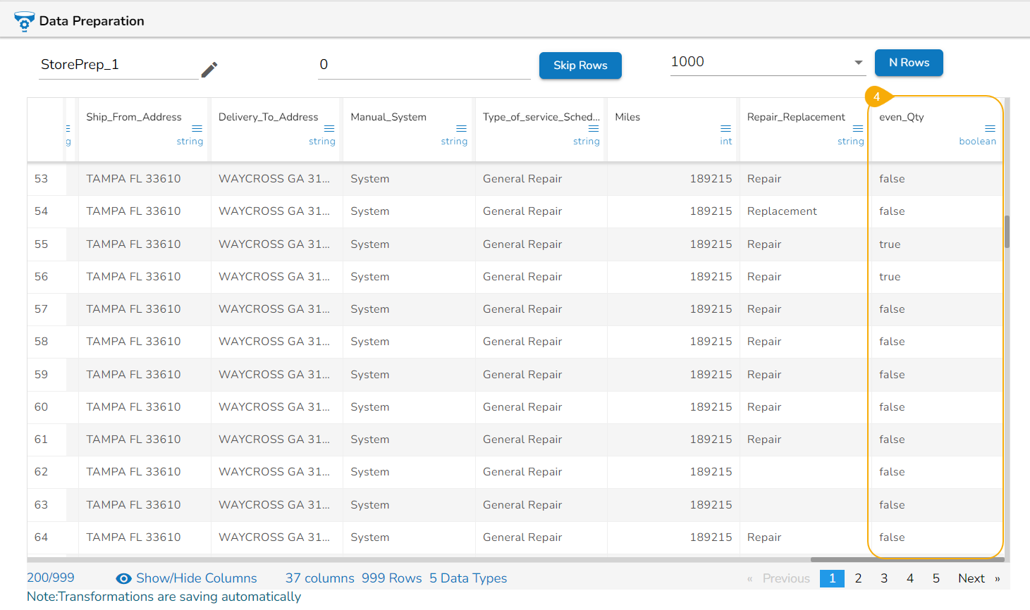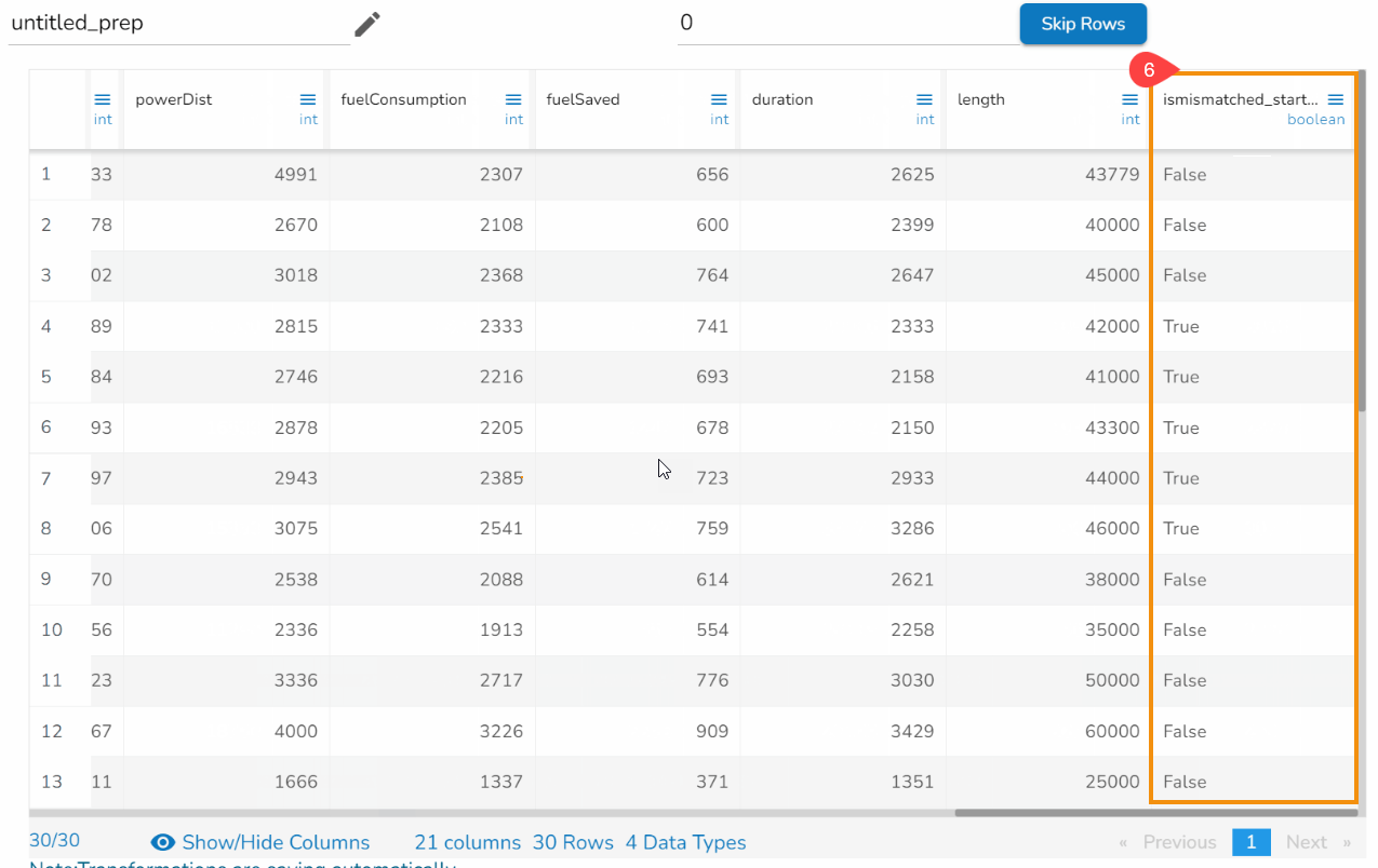 The result column gets added to the dataset, reflecting either True or False values after matching data values from the selected columns.