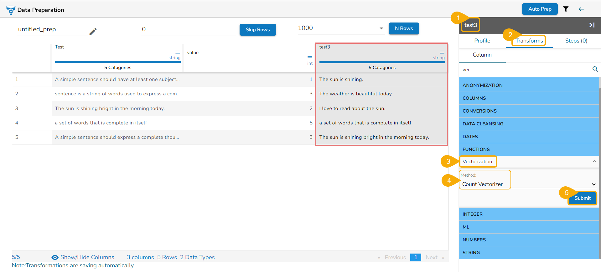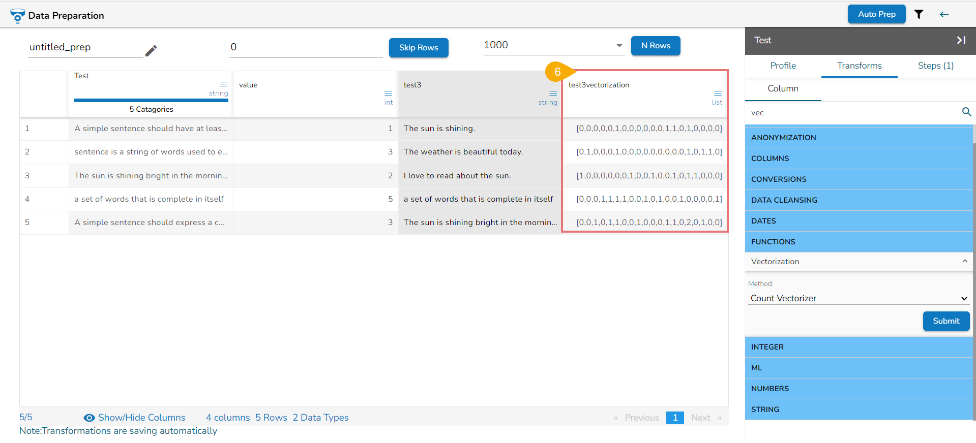 Check out the given walk-through on how to use the Vectorization transform with the Count and TFIDF Vectorization methods.