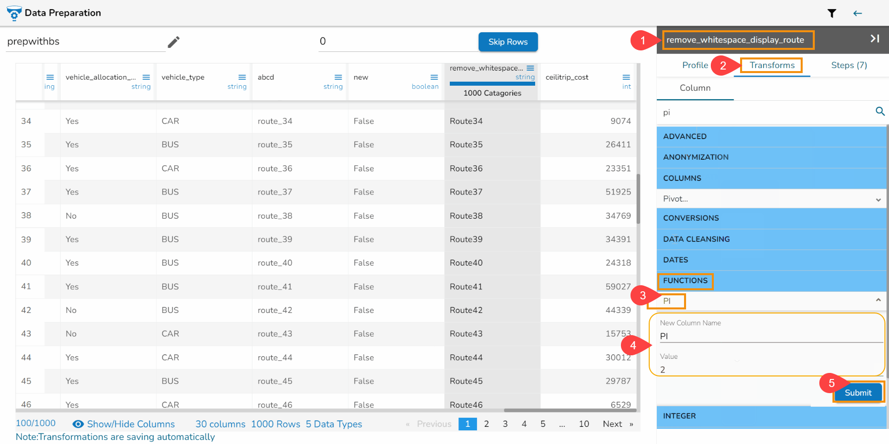 Select the Sqrt of Column transform from the FUNCTIONS category.