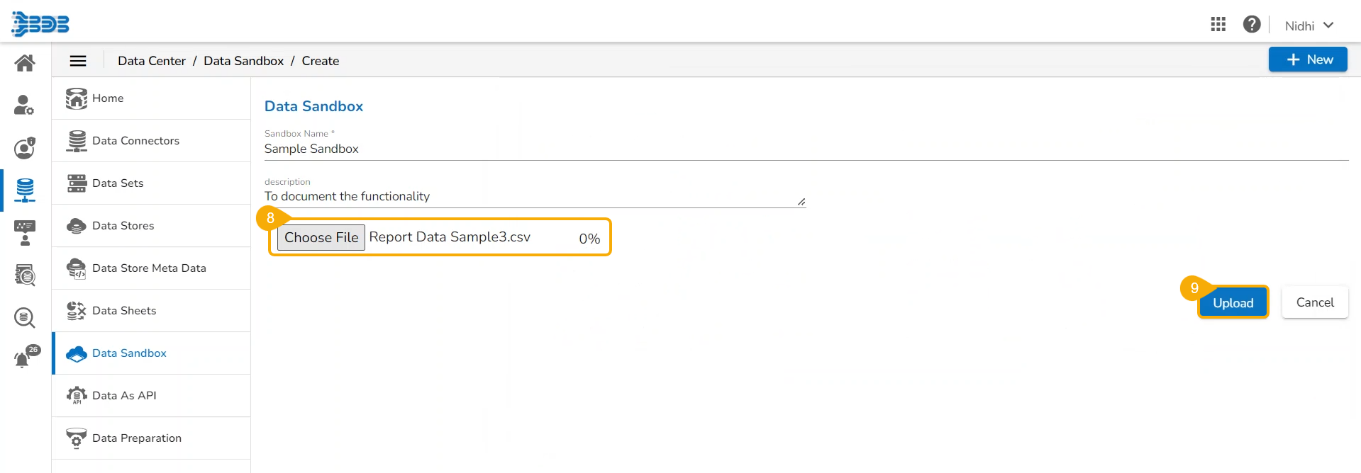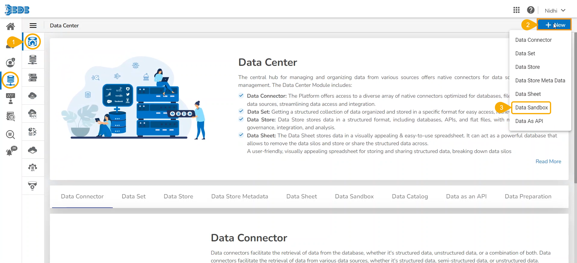 Get the step-by step process to create and save a new data sandbox under the Data Center module.