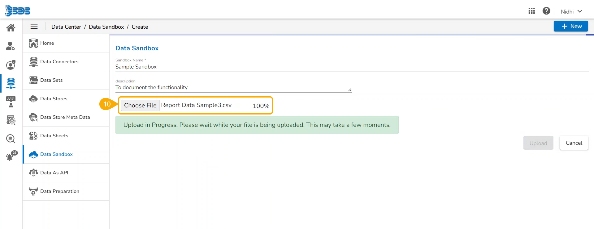 The File gets uploaded to the Data Sandbox (The increasing number count suggests the completion of file upload).