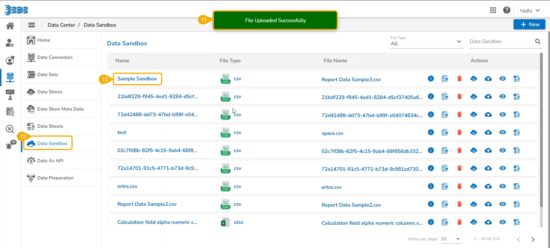 The Actions icons provided to a listed/saved Data Sandbox are as follows: