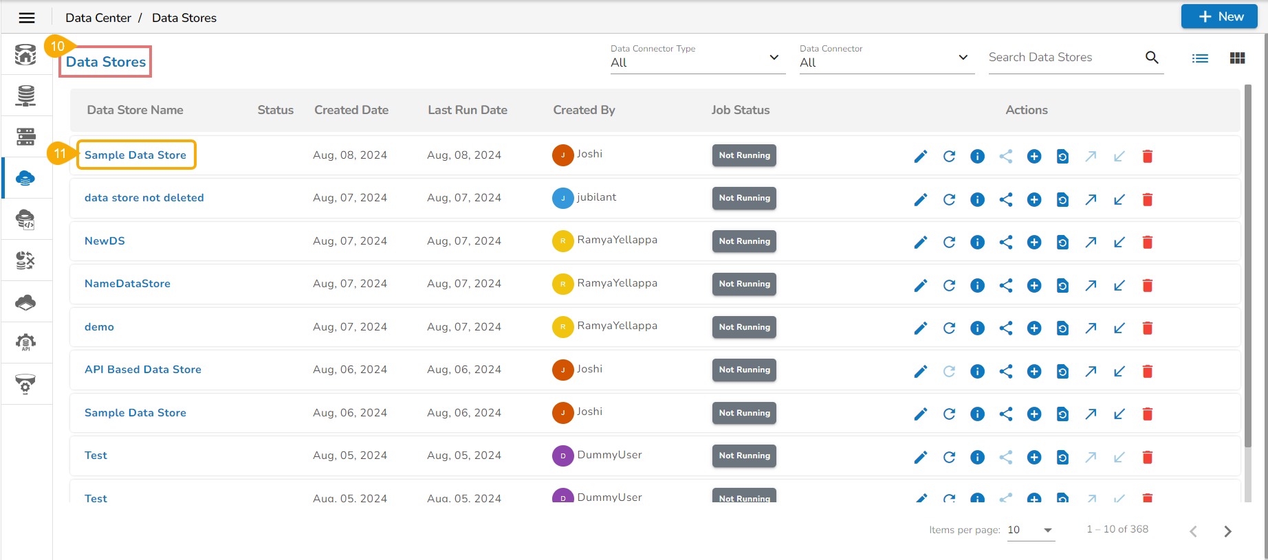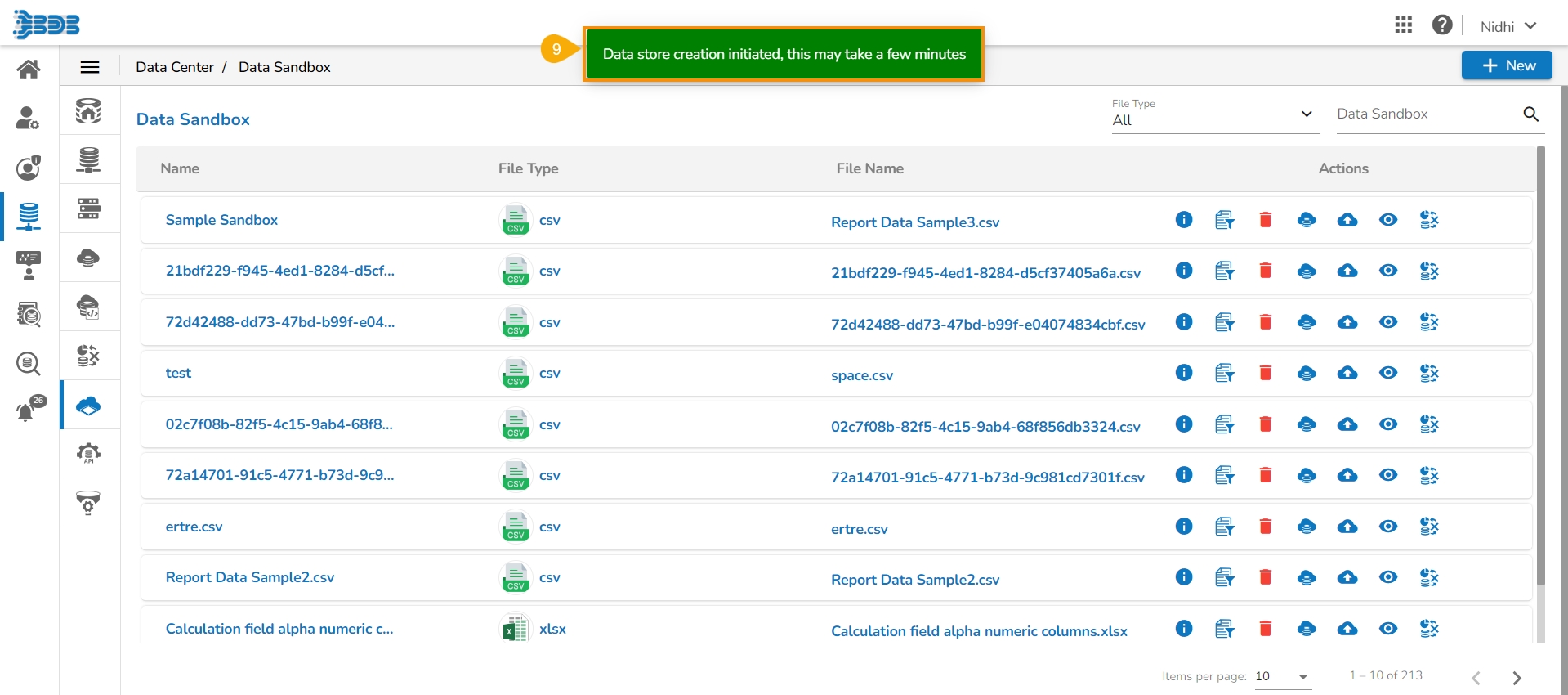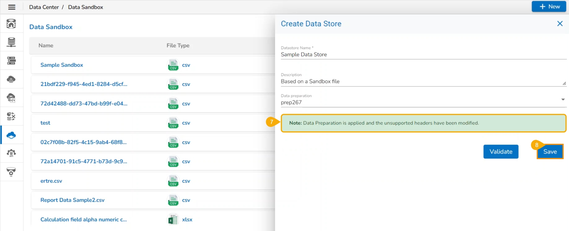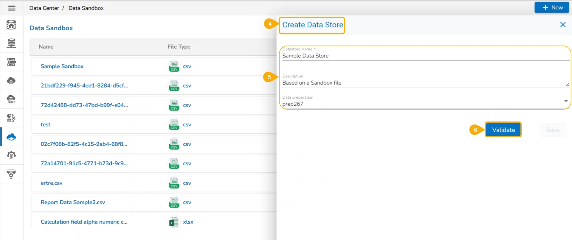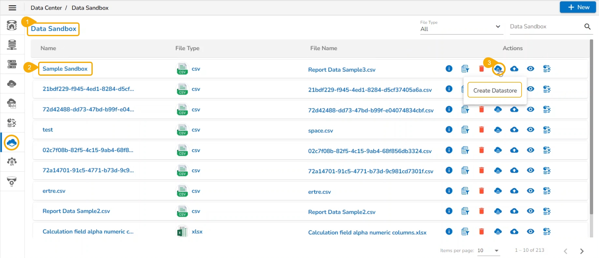 Click the Create Datastore icon for the selected Data Sandbox file.