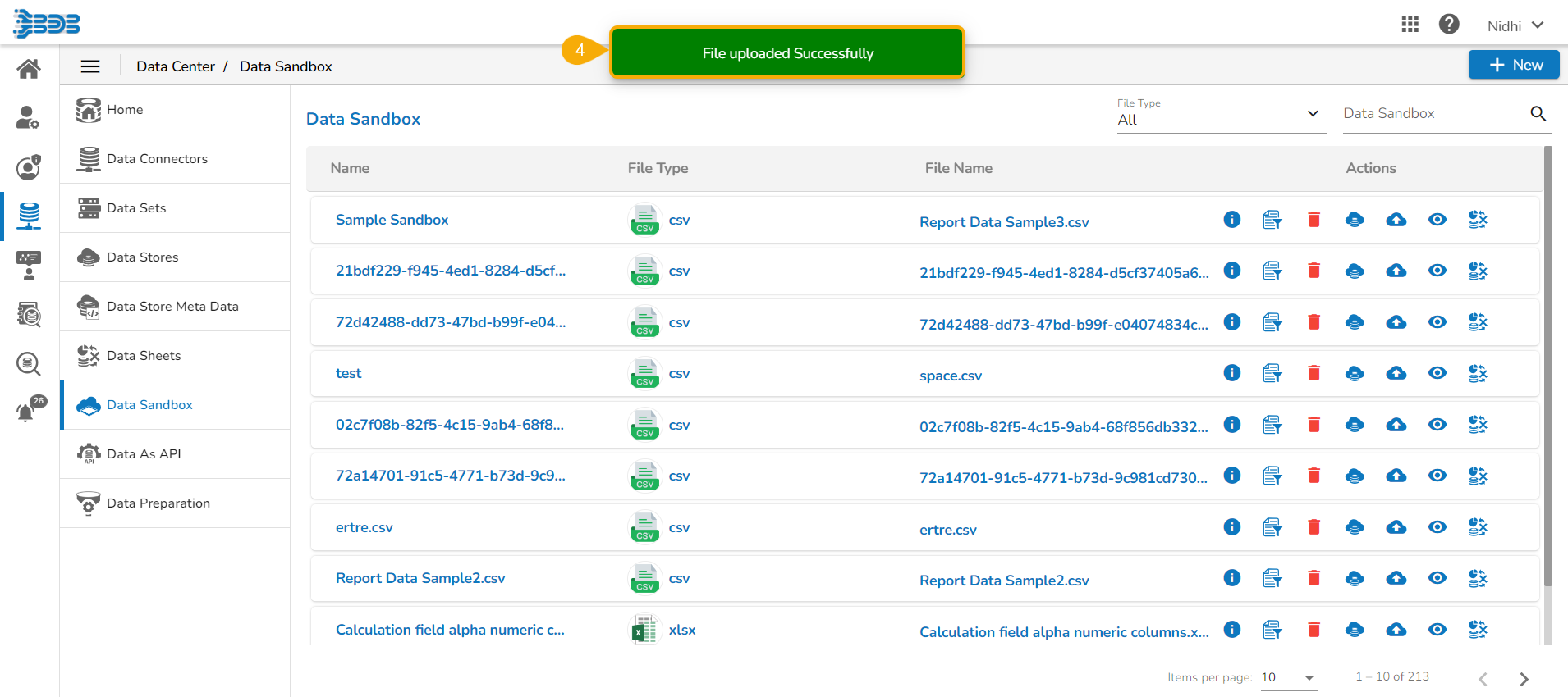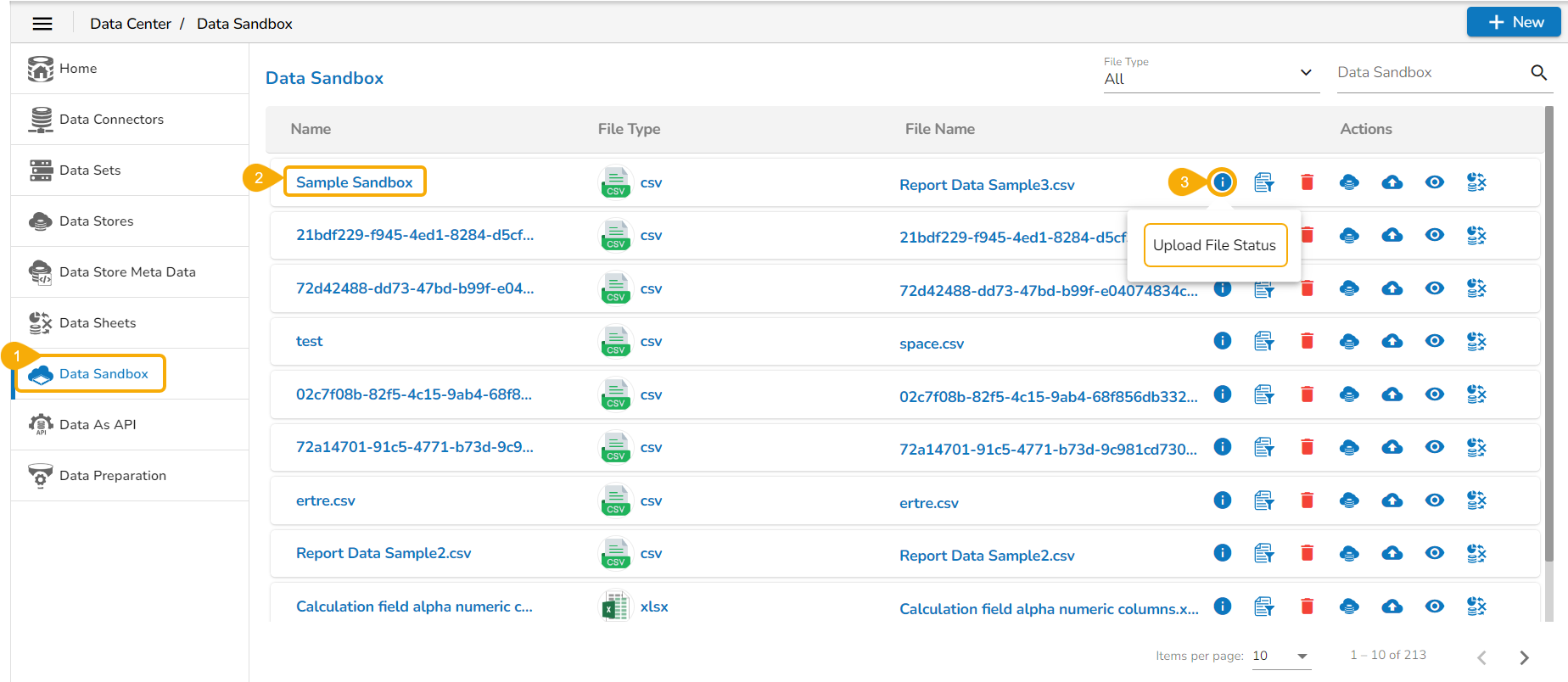 You can see the uploaded Data Sandbox listing at the top of the displayed Data Sandbox list.
